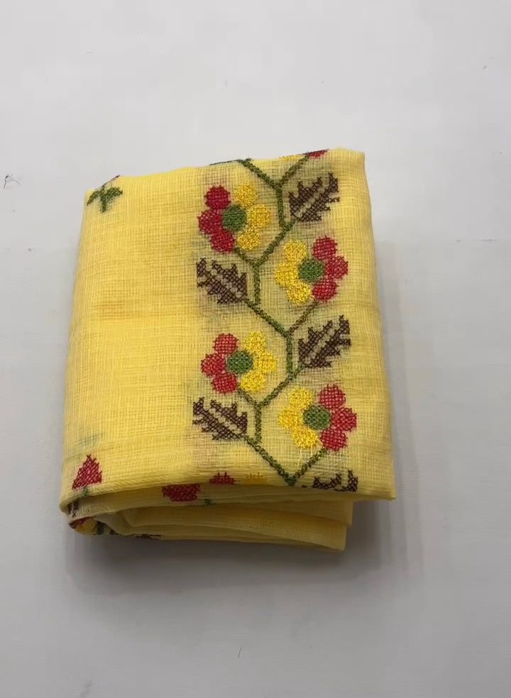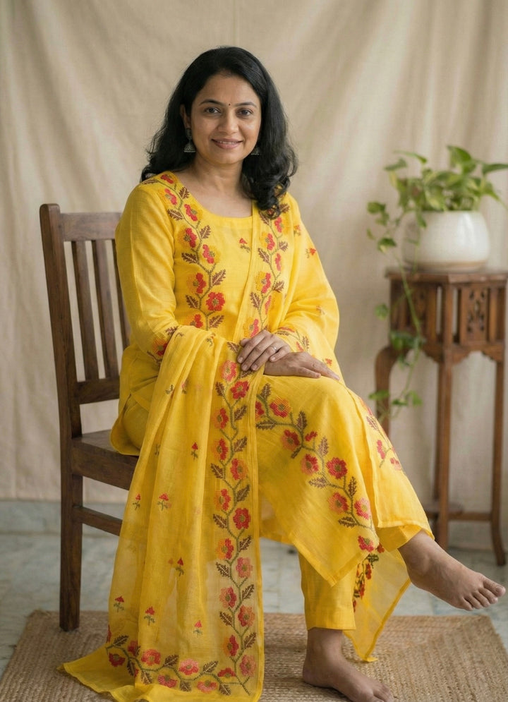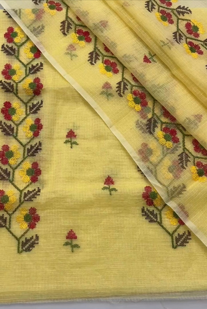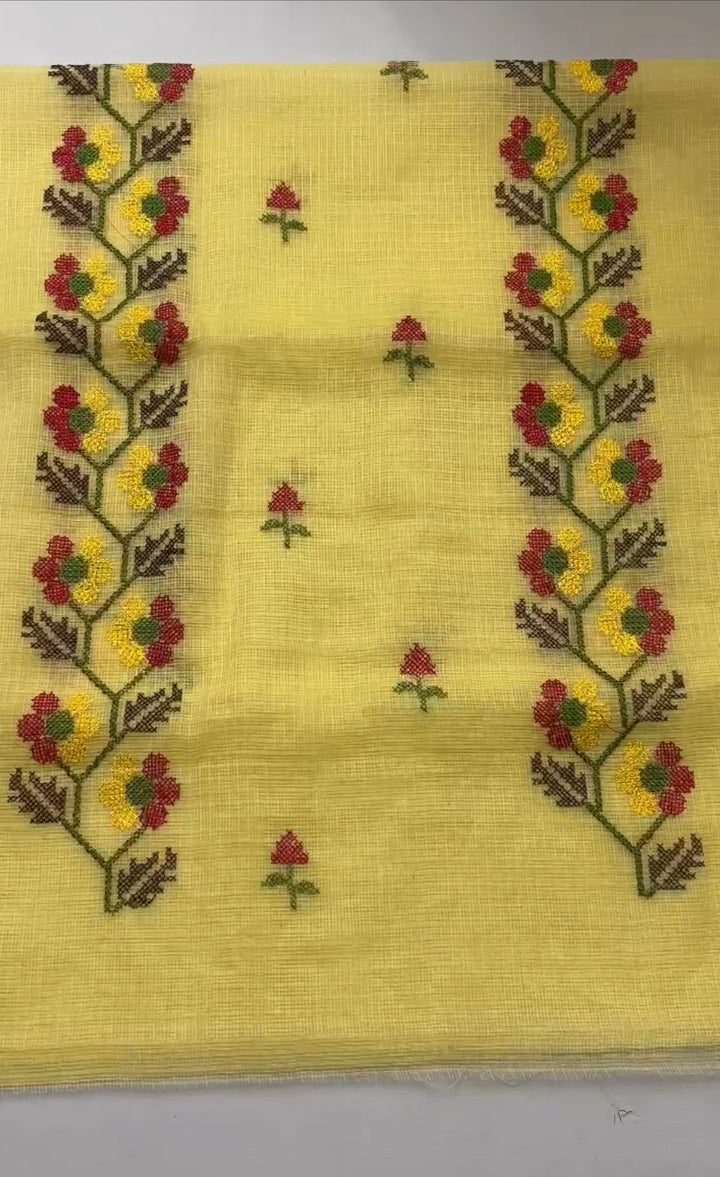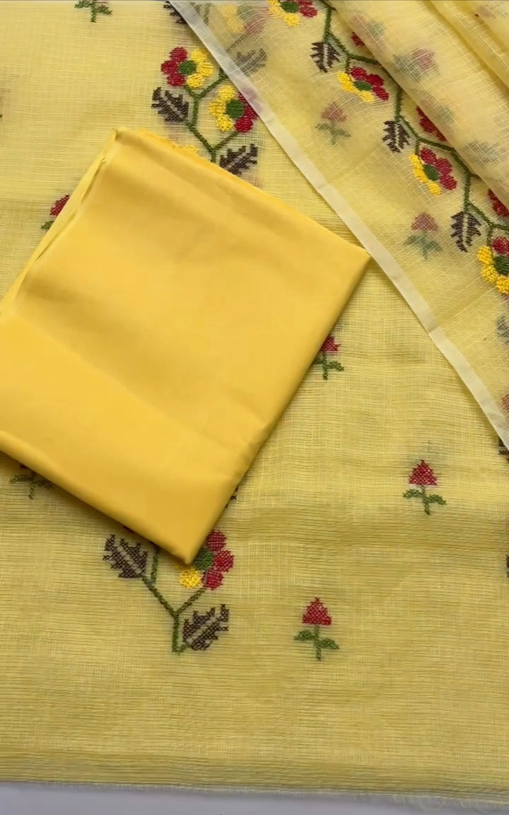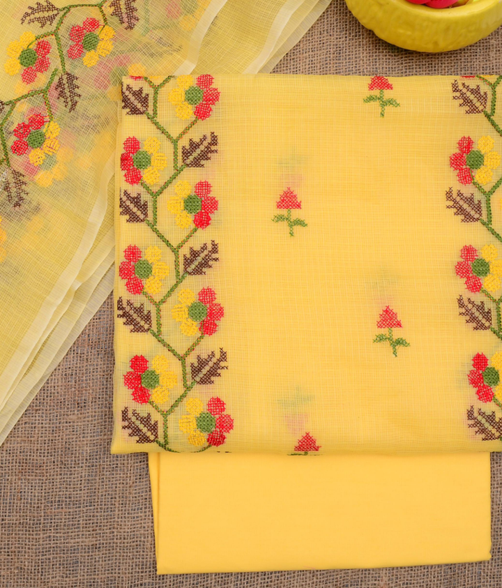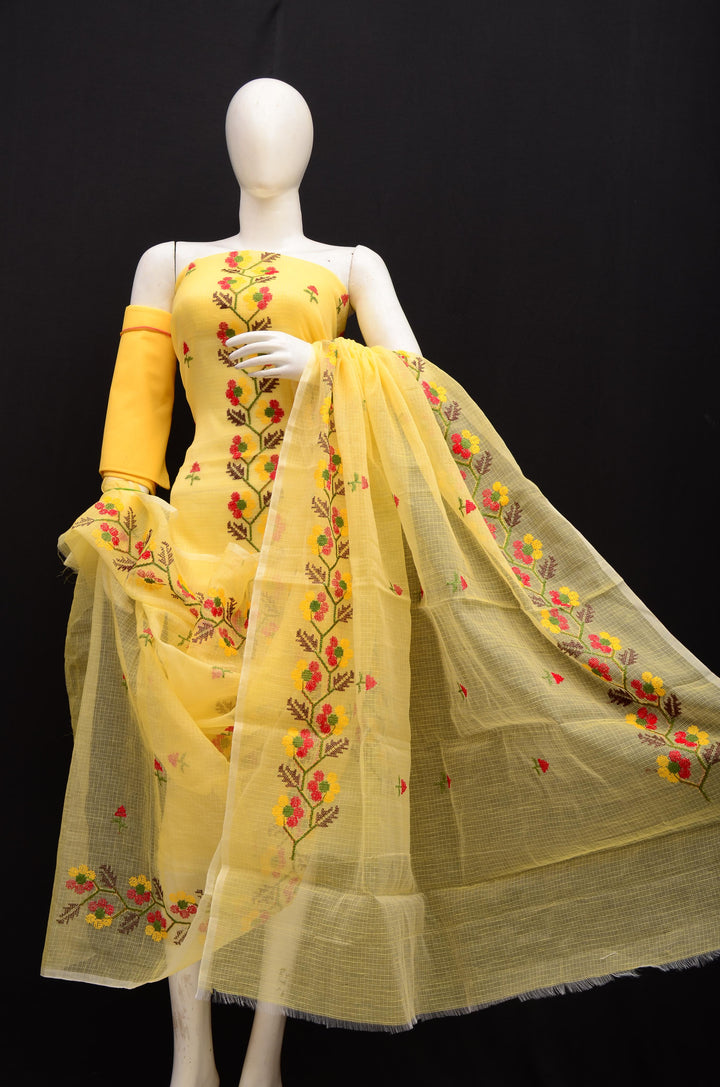 Surya- Beautiful Kota Doria Suit In Yellow Colour With Flower Embroidery Work (unstitched)