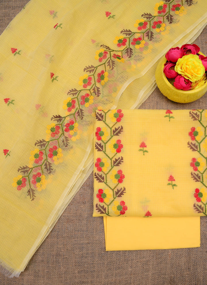 Surya- Beautiful Kota Doria Suit In Yellow Colour With Flower Embroidery Work
