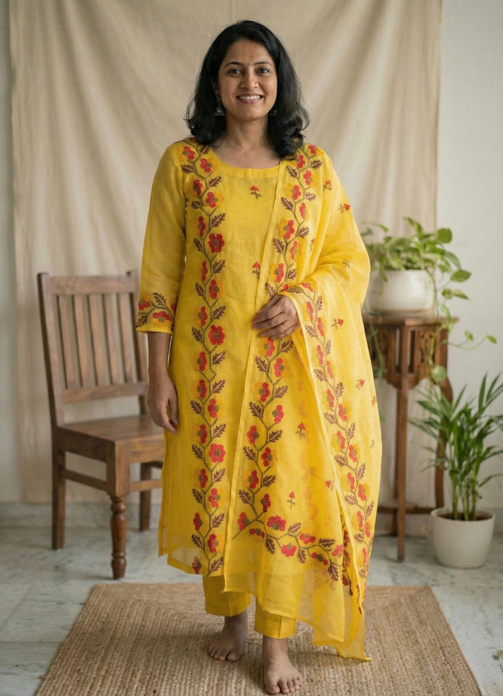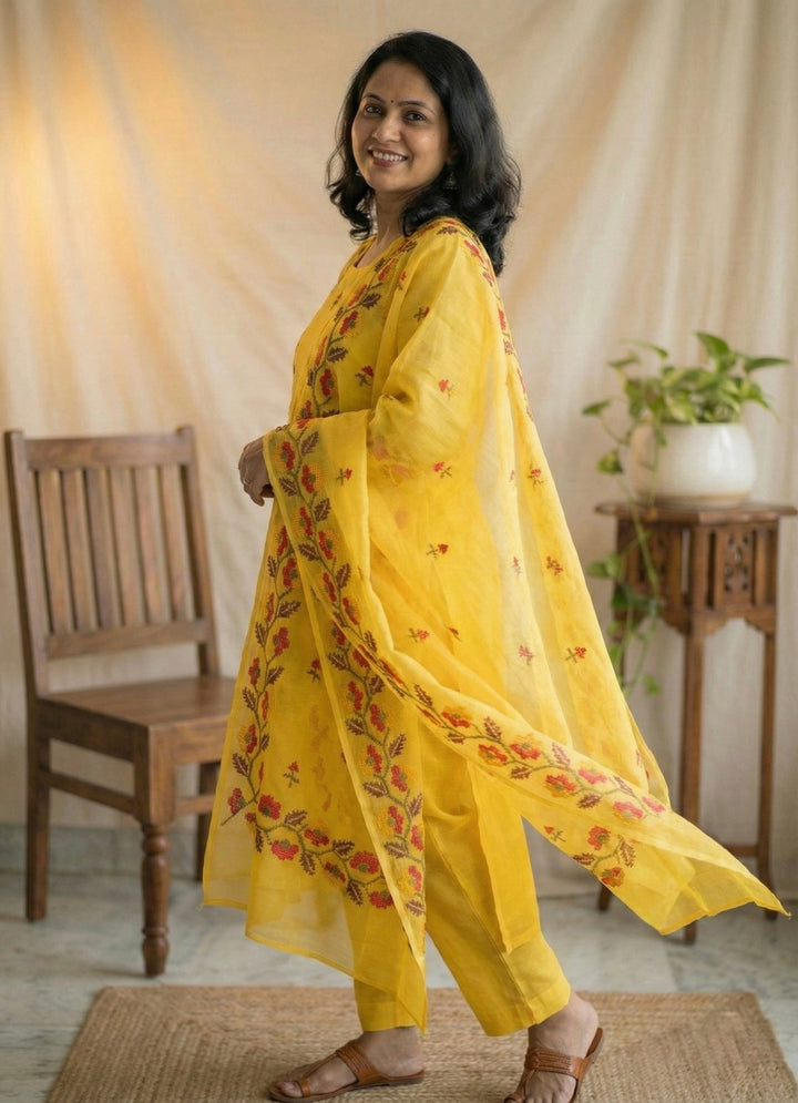 Surya- Beautiful Kota Doriya Embridery Work Suit In Yellow. This Traditional Suits 2.5 Mtr Top In Kota ,2.5 Mtr Dupatta In Kota,2.5 Mtr Bottom In Cotton, Wear This Kota Doria Suit With Kundan Necklace And Jhumkas On Day Time Function, This Designer Suit Comes With Beautiful Dupatta That Seems Perfect For Any Occasion,Free Shipping And Cod Available, Shipping Worldwide.