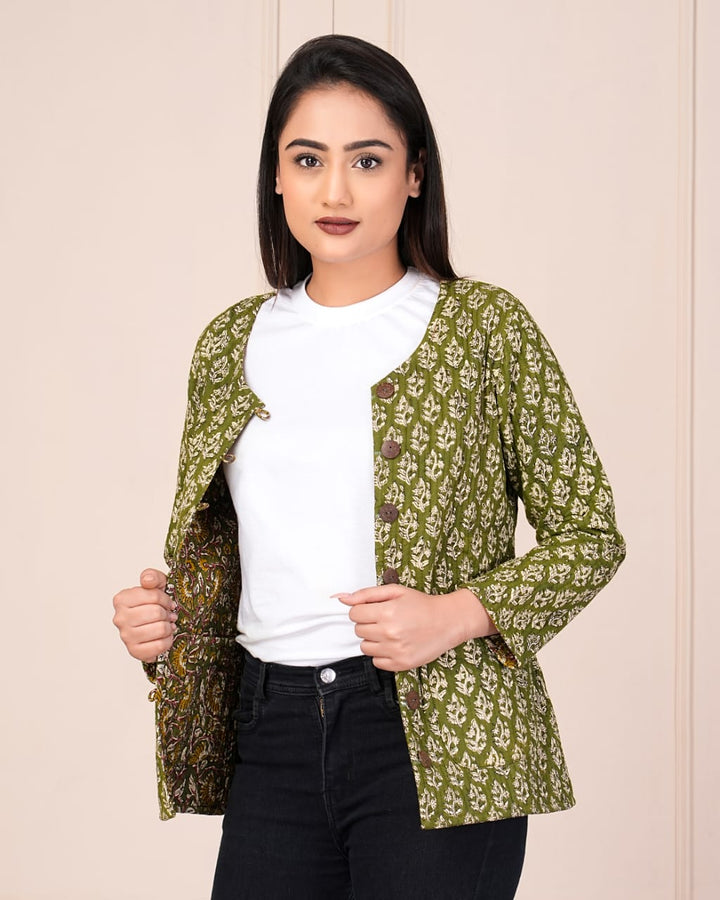 Beautiful Green Pure Cotton Quilted Reversible Print Jackets