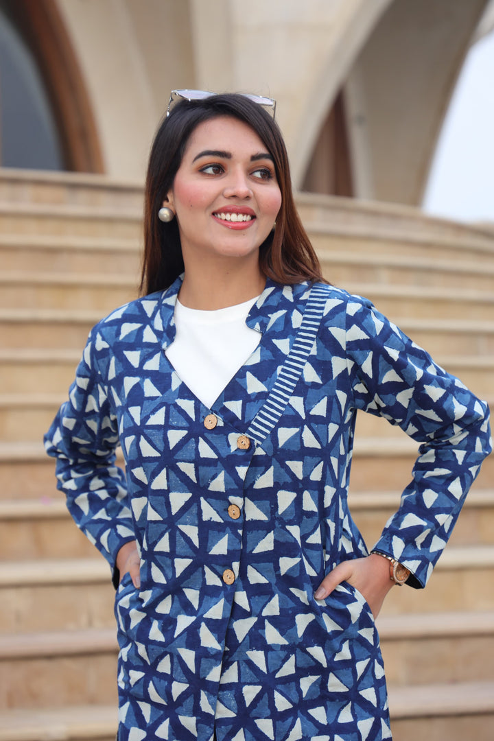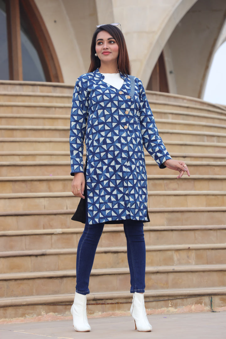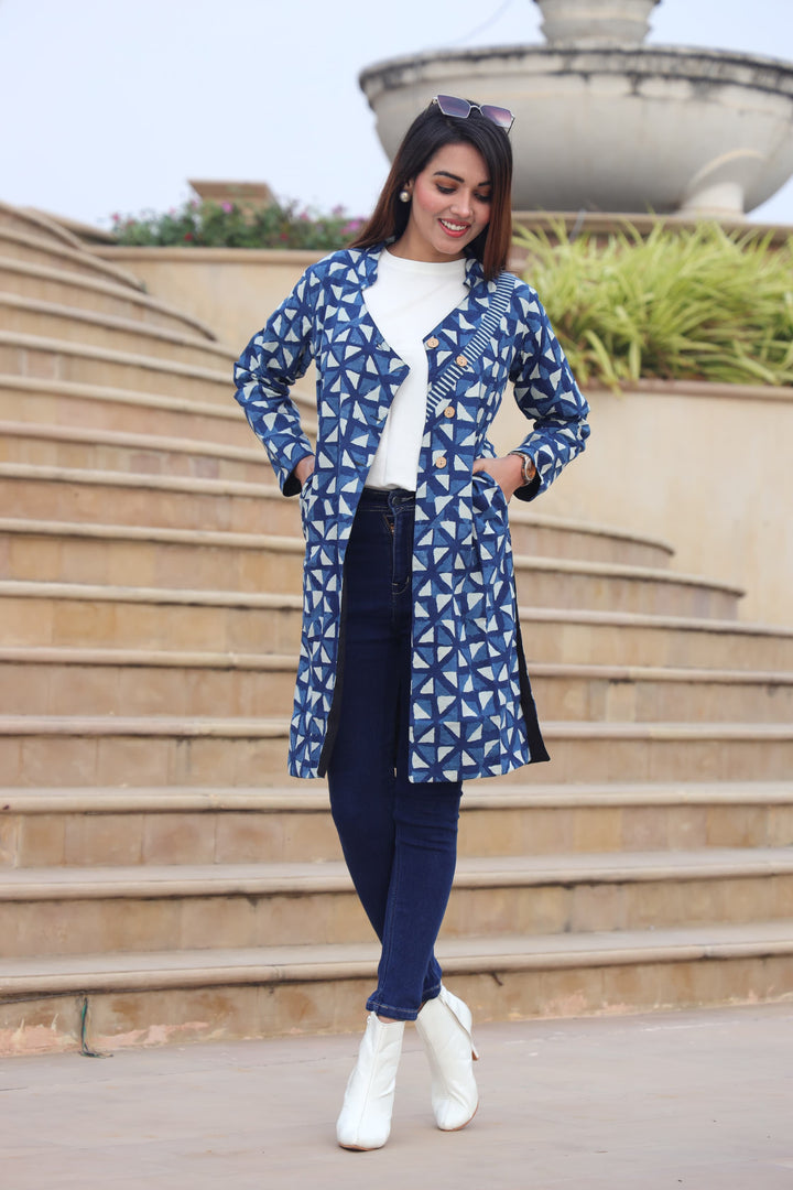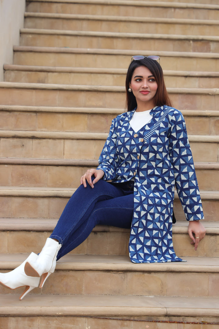 Beautiful Blue Bagru Hand Block Printed Pure Cotton Winter Jackets
