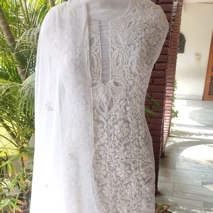 - Fancy Swan White Georgette Chikankari Salwar Kameez Set Unstitched
