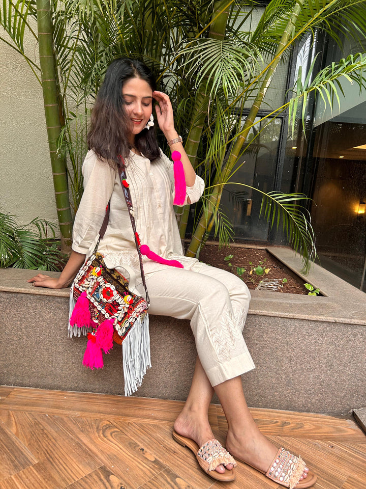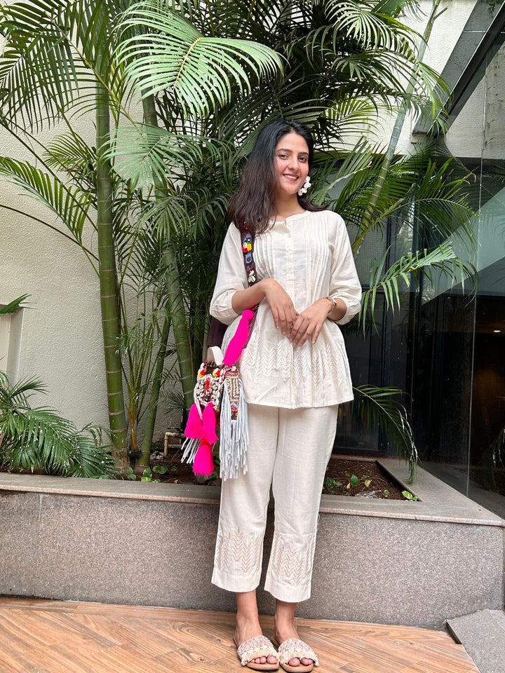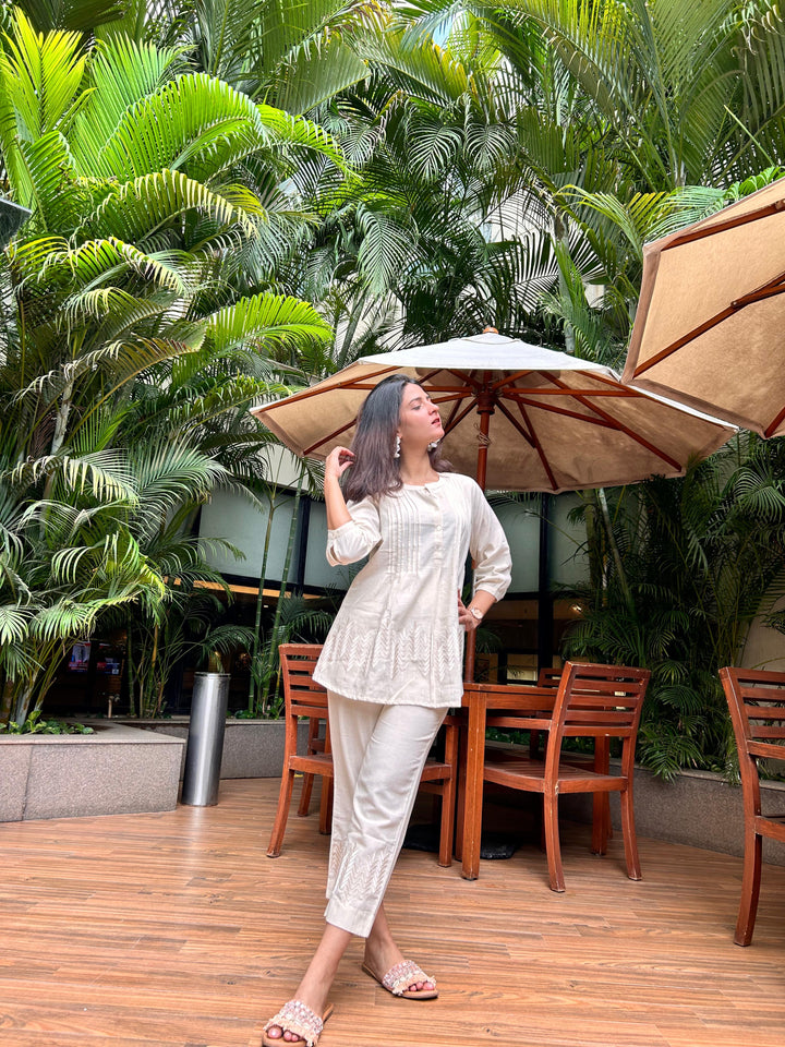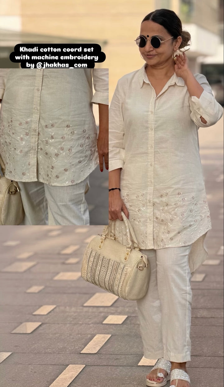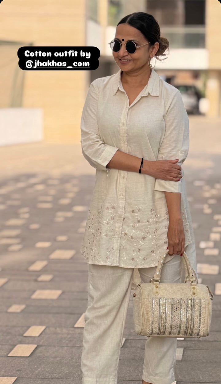 - Front Button 3/4 sleeves cotton shirt with embroidery work paired with embroidery work bedge Straight Pant