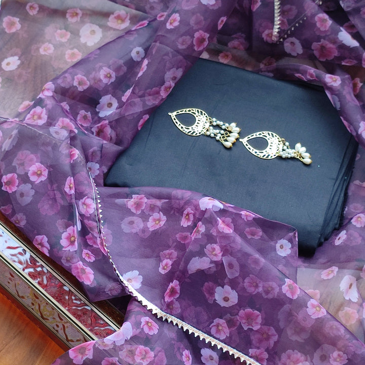 Grab Now, This Black and Purple Organza Dupatta Punjabi Suit. This Fancy Organza Salwar Suit Comes With 2.5 Mtr Fancy Top, 2.5 Mtr Designer Dupatta & 2.5 Mtr Plain Bottom.This Organza Fabric Suit Set Is Perfect For Haldi.This Designer Organza Suit Set Is Floral Printed All Over Dupatta.