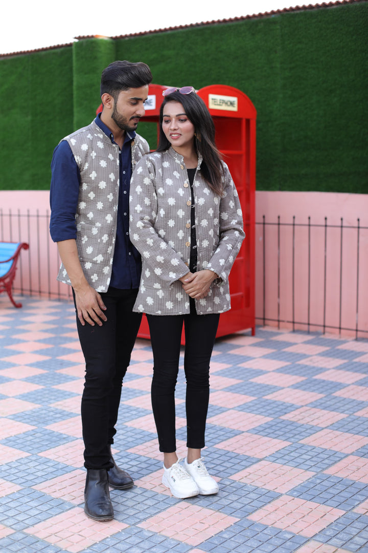Grey Color Twinning Couple Pure Cotton Bagru Print Quilted Reversible Jackets