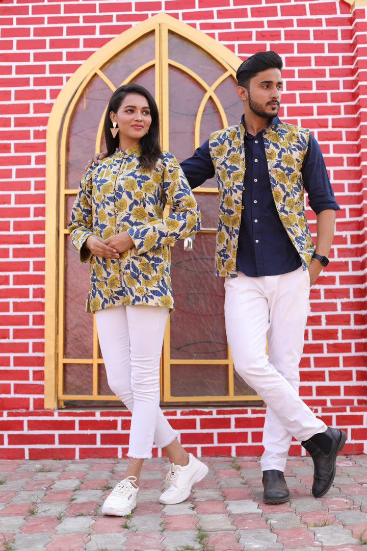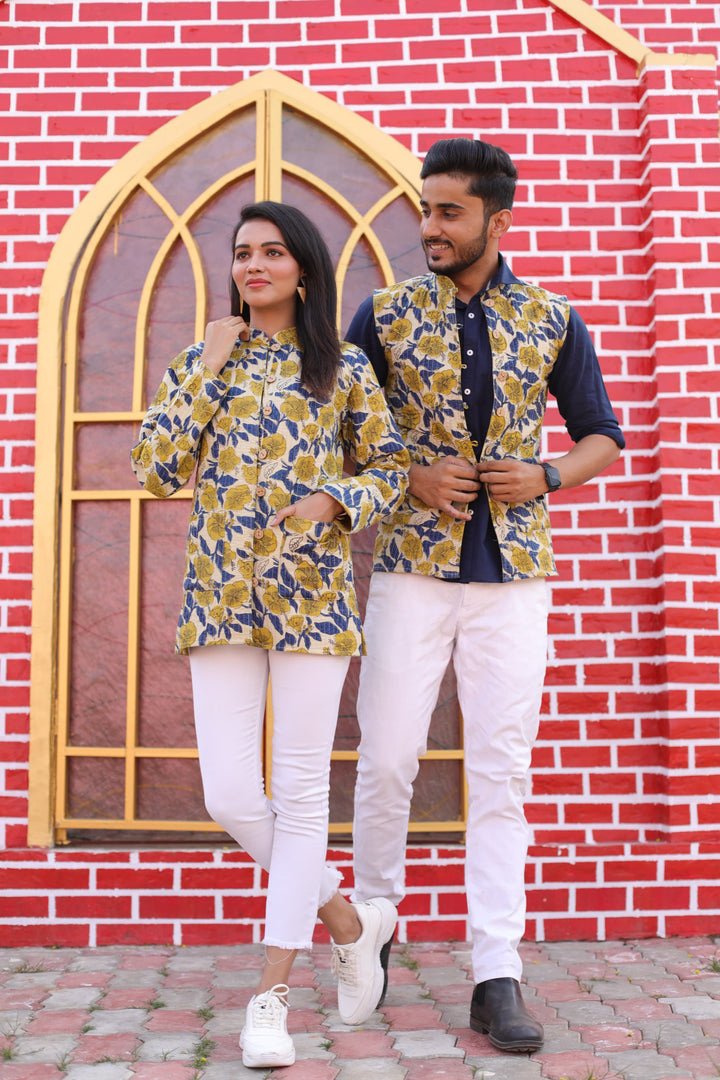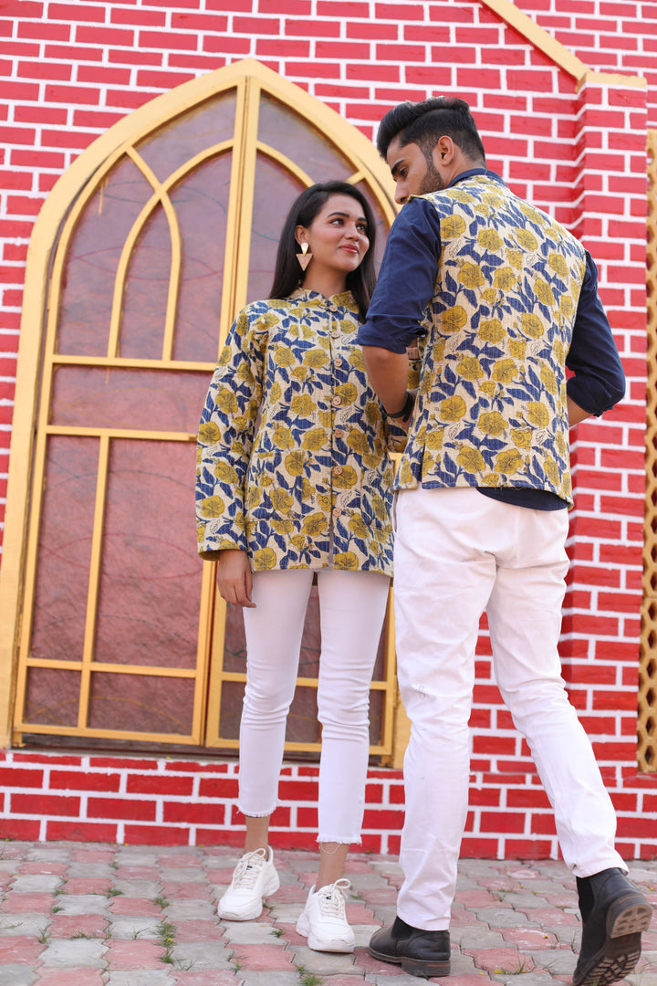 Yellow Color Twinning Couple Pure Cotton Bagru Print Quilted Reversible Jackets
