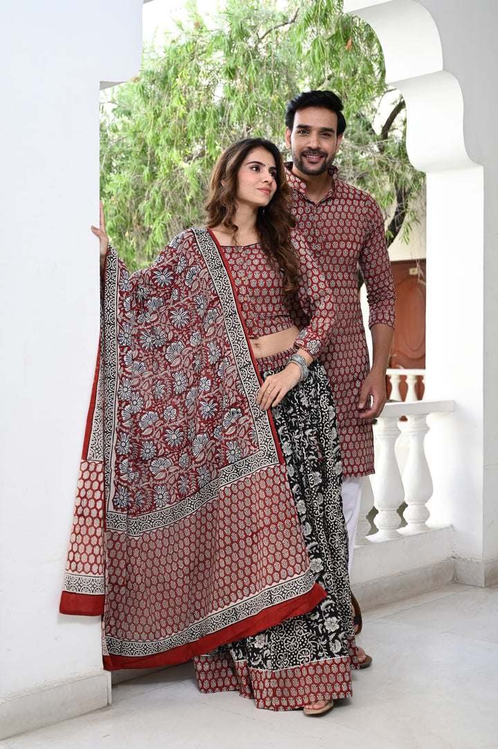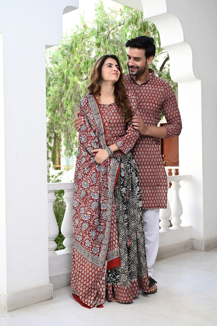 Black And Red Pure Cotton Twinning Couple Set In Block Print