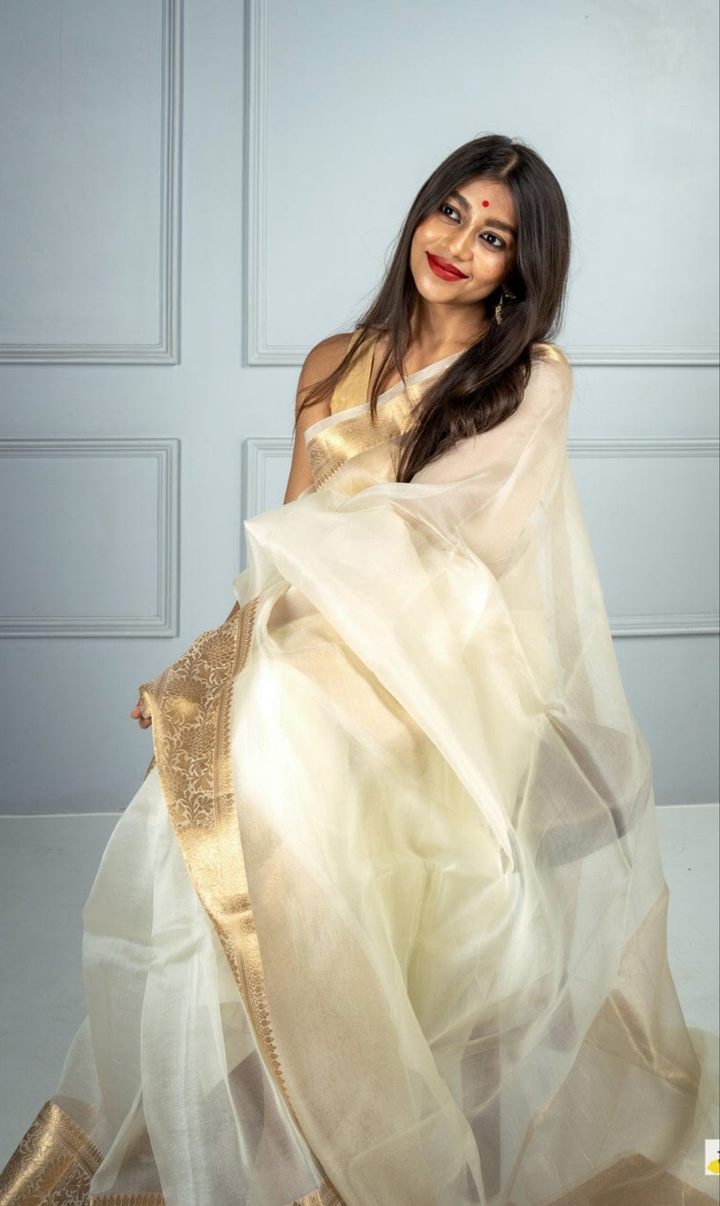 - Crafted from luxurious silk, the saree offers a lightweight and graceful drape