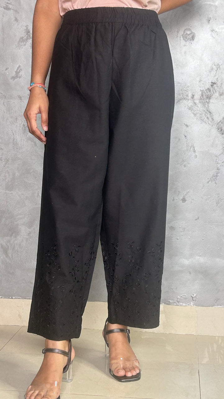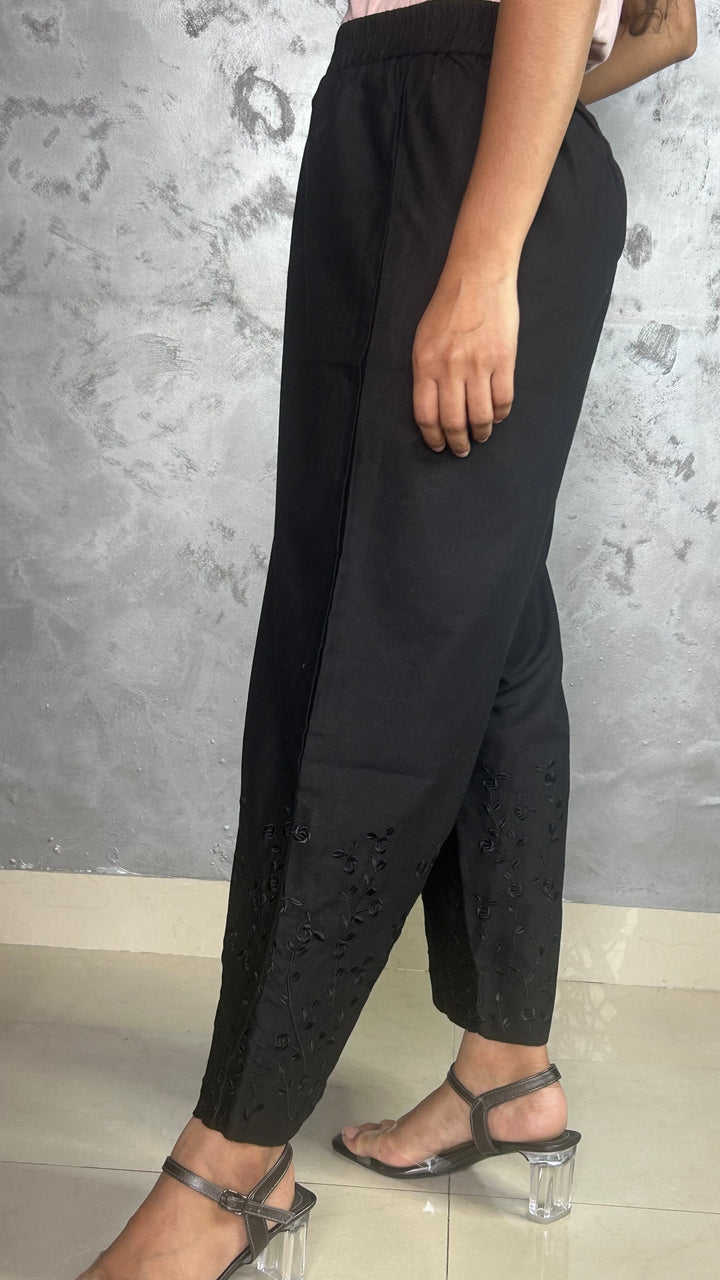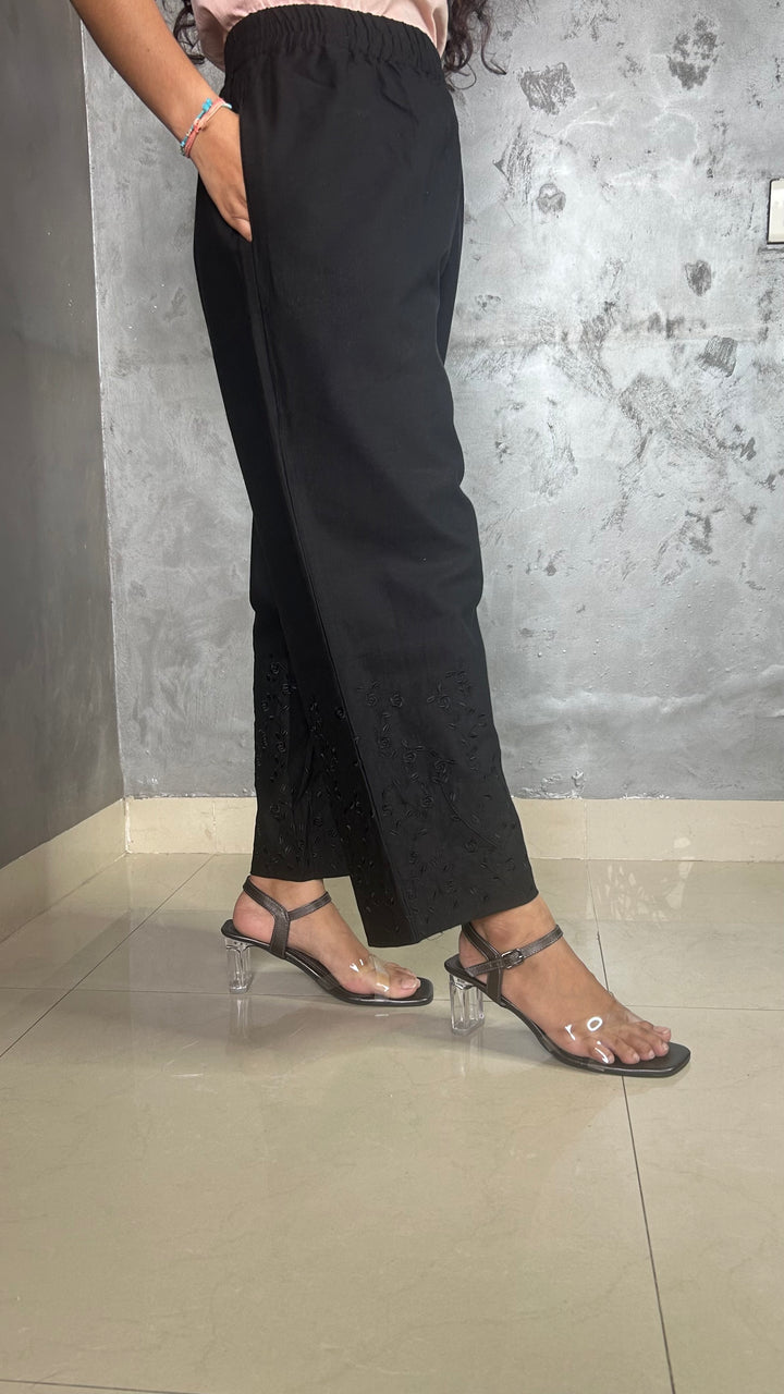 Karina Black Embroidery Straight Pant In Cotton For Women