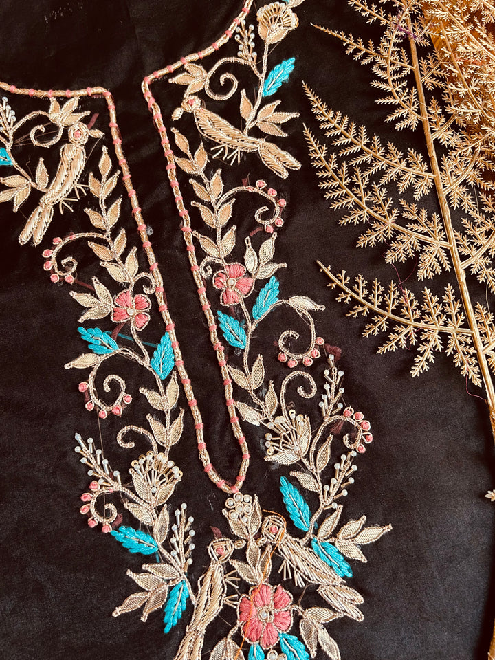 Add To Your Ethnic Collection This Unstitched Black Gota Patti Organza Kurti With. This Gorgeous Unstitched Kurti is Adorned With Stunning Gota Patti Work On Neckline. Get This Unstitched Kurti Stitched According To Your Fit, Style And Comfort.