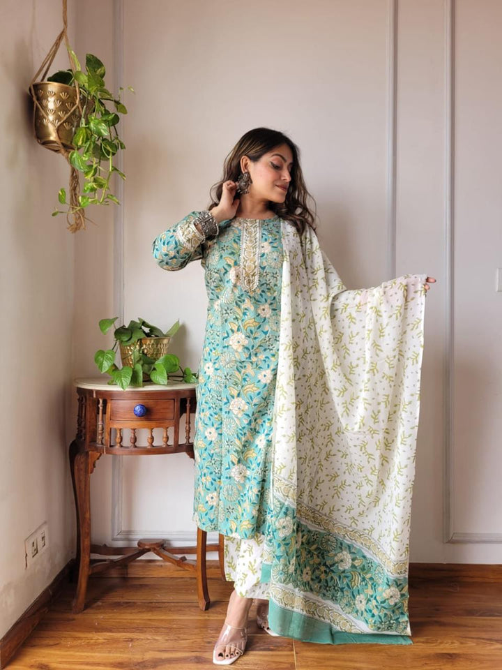Green Bagru Handblock printed designer Cotton Suit set with mulmul duptta available..( Office Wear)*