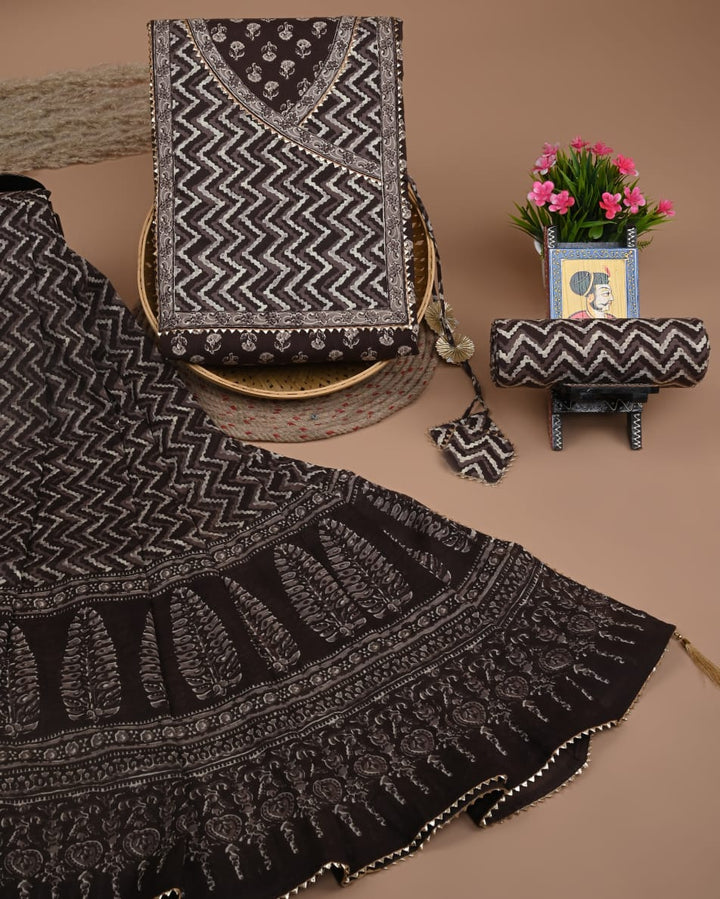 True Elegance Will Come Out Of Your Dressing Style With Our Black Colored Dress Material. This Cotton Angarkha Suit is Beautifully adorned with Zari And Gota Patti Work On neckline, this suit comes along with cotton bottom and Matching cotton dupatta With Gota Patti Border. Women can buy this suit to wear for their Festive wear, homely events and ideal for any fashionista.