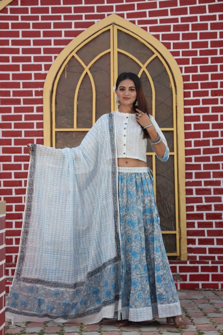 Blue & white Bagru Hand Block Printed Designer Top & Skirt With Mulmul Dupatta.
