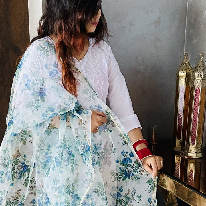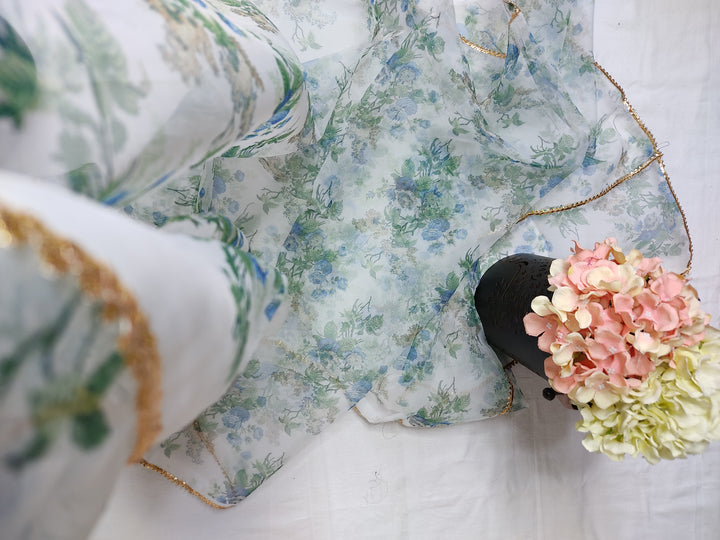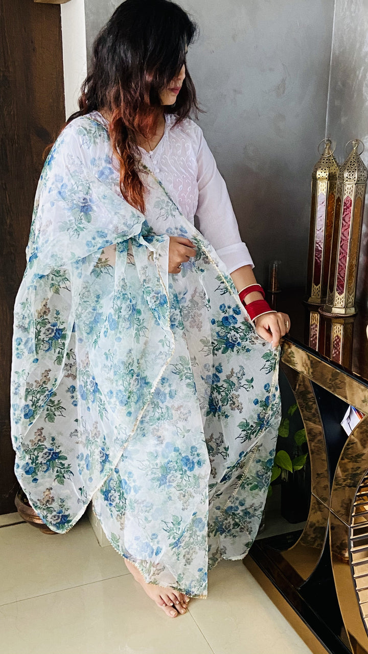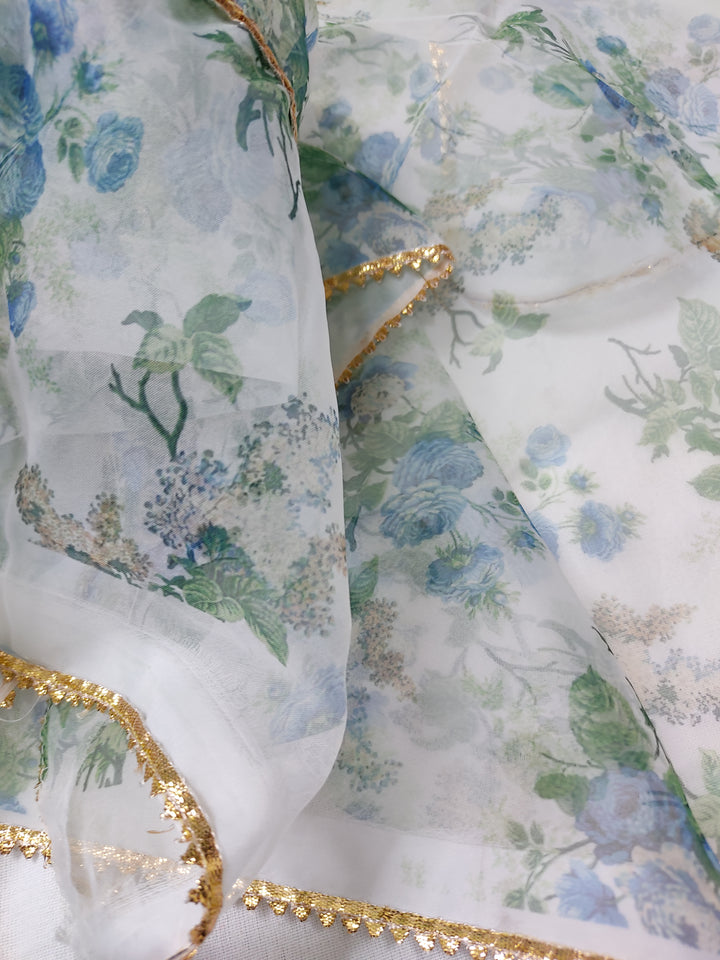Blue And White Floral Organza Dupattacomes With Rose Gold Gota Border, Flaut The Style By Carrying It With Kundan Set And Gota Patti Work With Potlis, This Floral Dupatta Length Is 2.5 Meter.,Free Shipping And Cod Available, Shipping Worldwide.