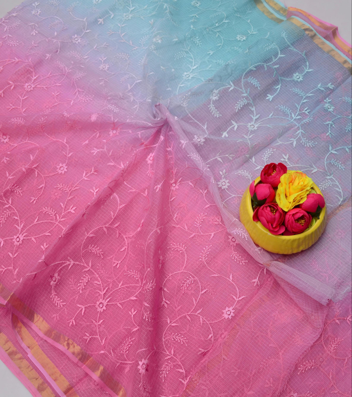 Pihu- Blue & Pink Kota Doria All Over Embroidery Work Saree