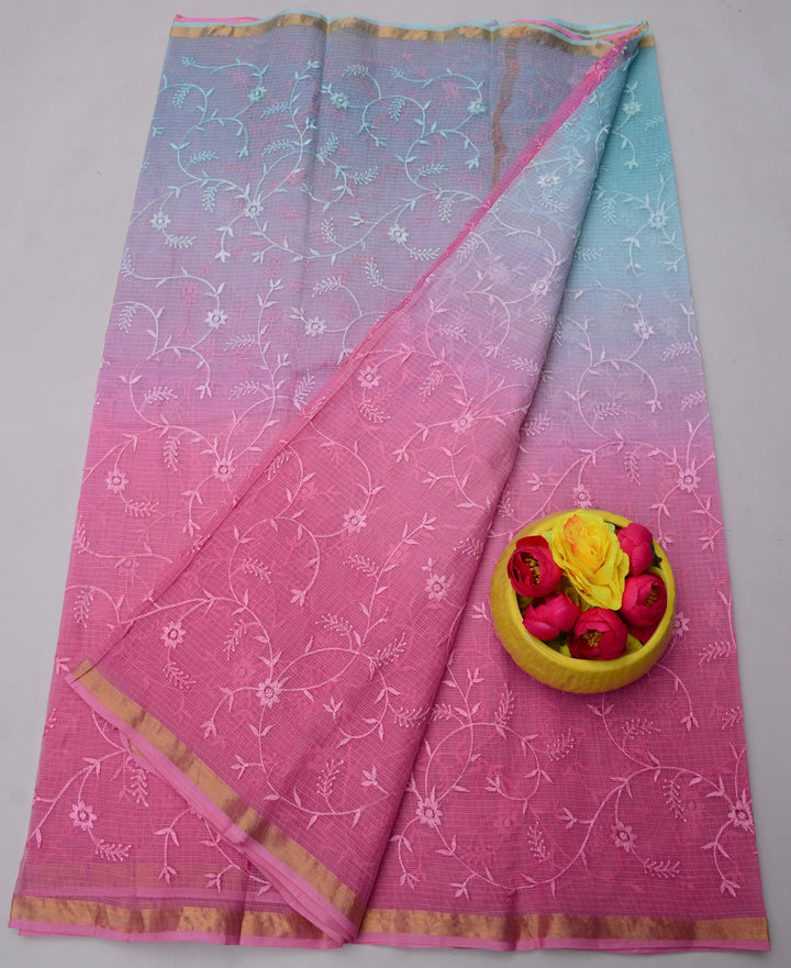 Pihu- Blue & Pink Kota Doria All Over Embroidery Work Saree, This Kota Doria Saree In Cotton Comes With Blouse.Wear This Kota Doria Saree as Office Wear Saree, Daily Wear Saree Or Kitty Party Saree. Saree Length - 6.5 Mtr With Blouse.