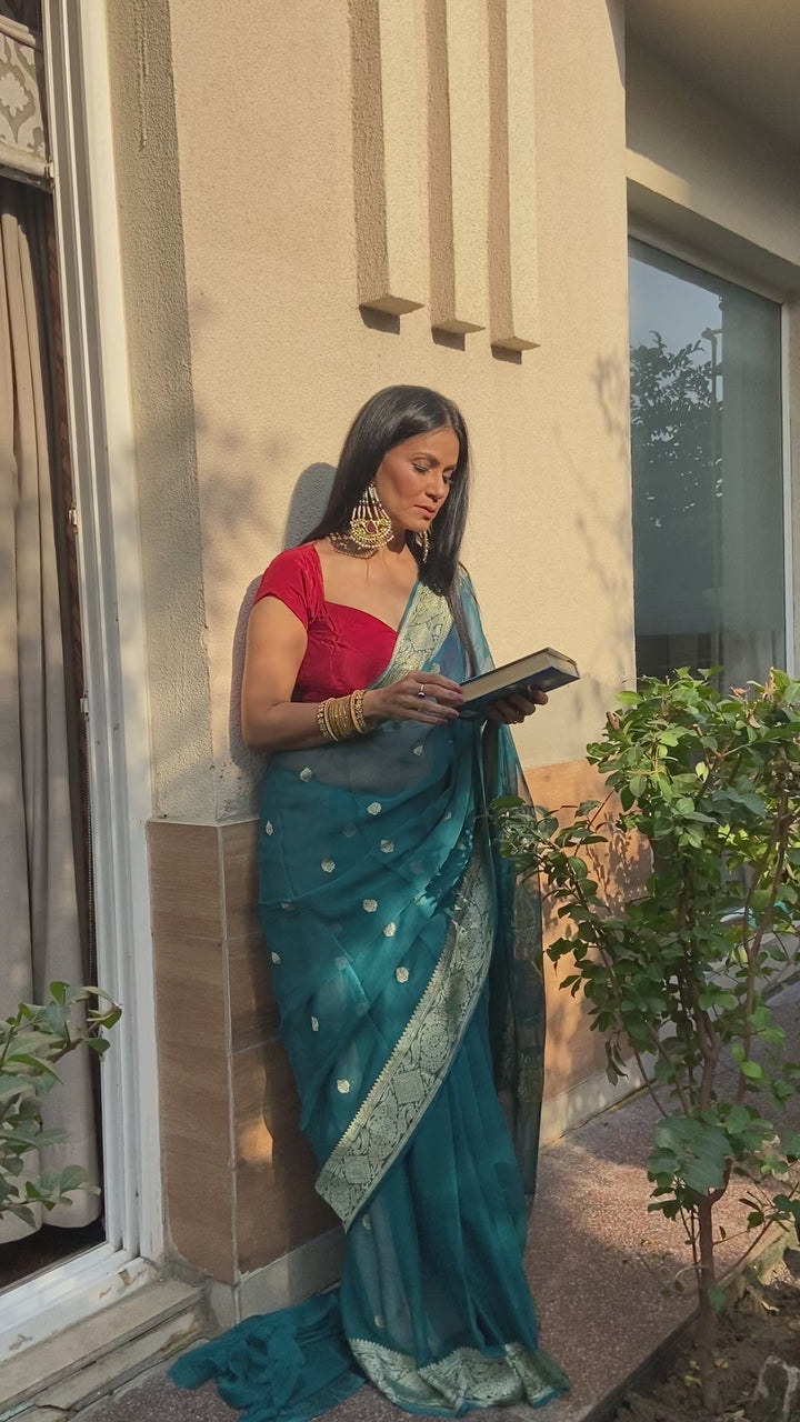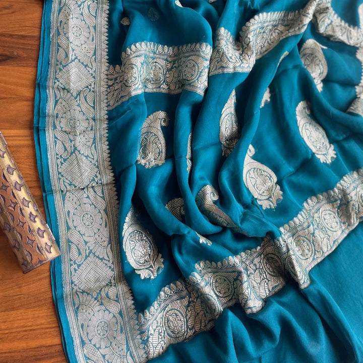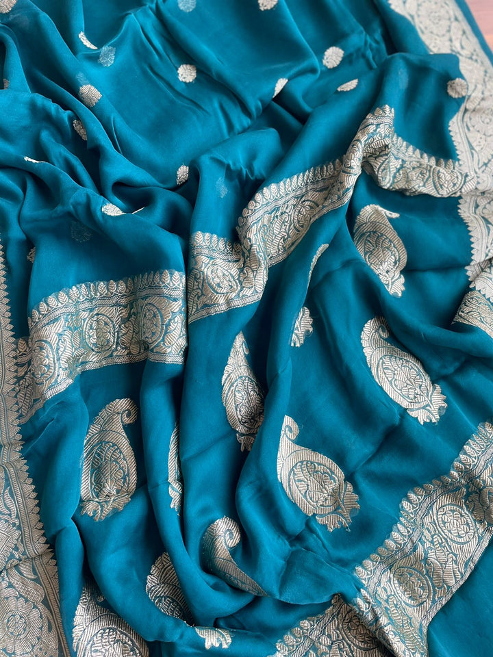 - Designer Peacock Blue Banarasi Khaddi Saree
