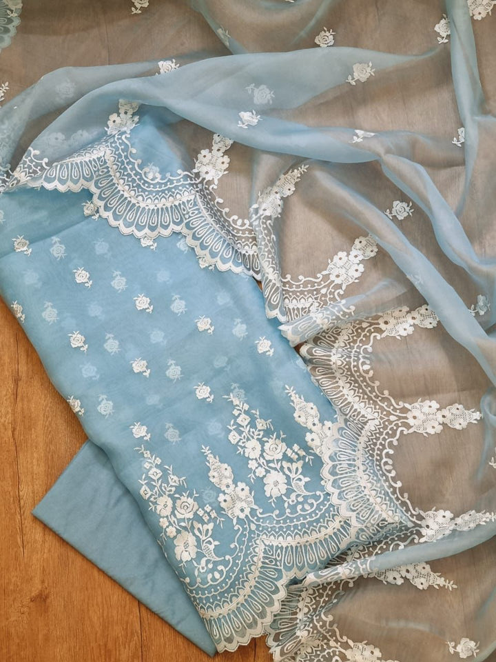 Blue Banarasi Organza Silk Embroidery Suit(Unstitched)