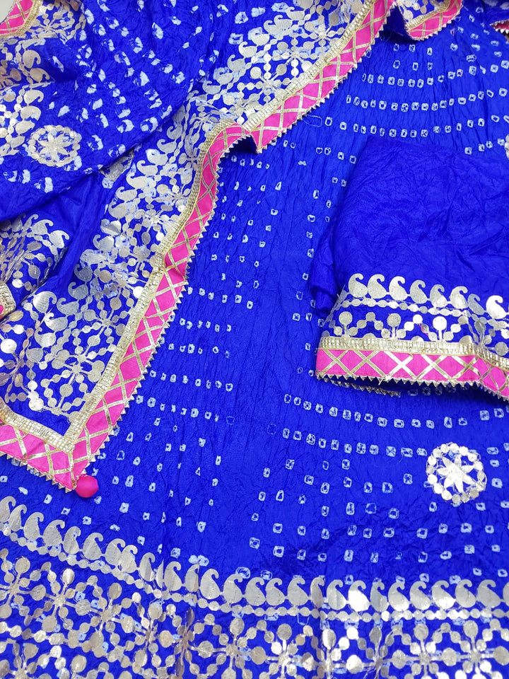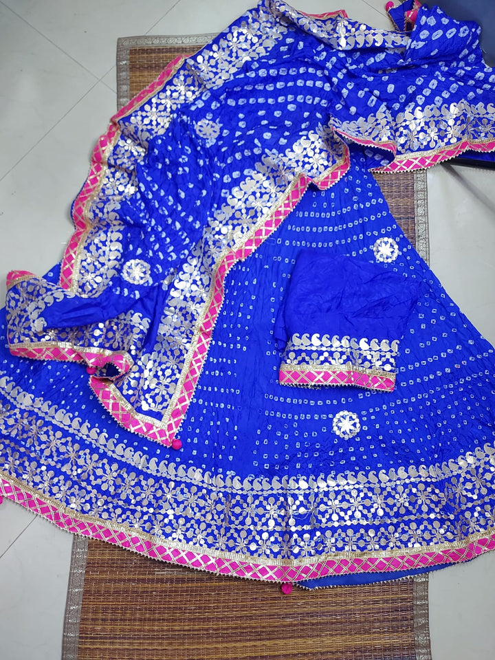 Steal The Show When You Wear This Stunning Blue Silk Lehenga Embellished With Bandhani Print All Over And Heavy Gota Border To Add to Its Beauty. Perfect For Any Festive Or Wedding Fucntion. This Beautiful Art Silk Lehenga Is Paired With A Matching Orange Color Silk Choli And Orange Color Banarasi Silk Dupatta Embellished With Gota Patti.