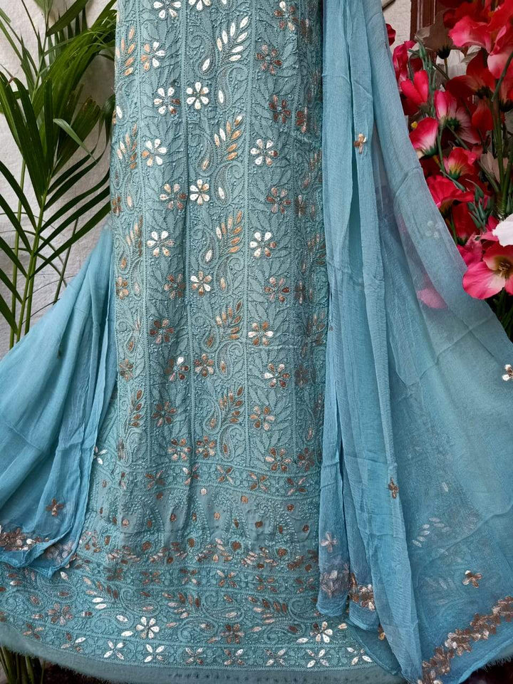 - "Asmani Sukoon" Calming Blue Lucknowi Chikankari Gota Patti Salwar Suit Fabric