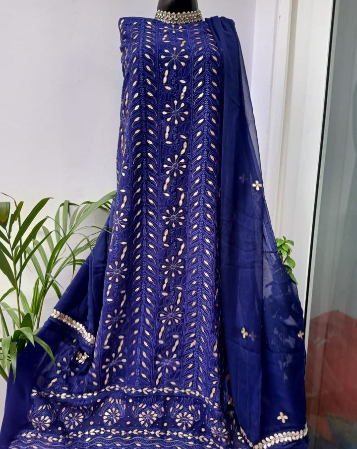 "Neela Noor" Blueí«í?Chikankari Gota Salwar Suit,This Chikankari Salwar Suit Comes With Pure Hand Karigari And Mukaish And Gota Patti Work As Shown In The Picture.Georgette Chikankari Top With Chikankari Gota/Mukaish Work And Chiffon Duptta With Gota Work And Matching Plain Santoon Bottom.