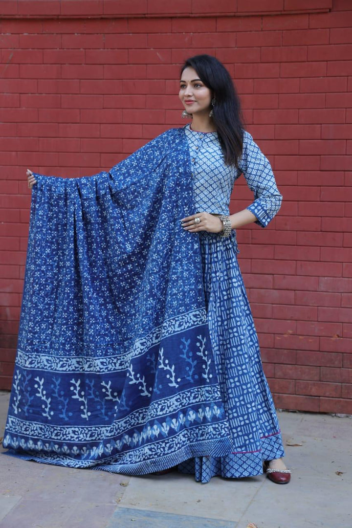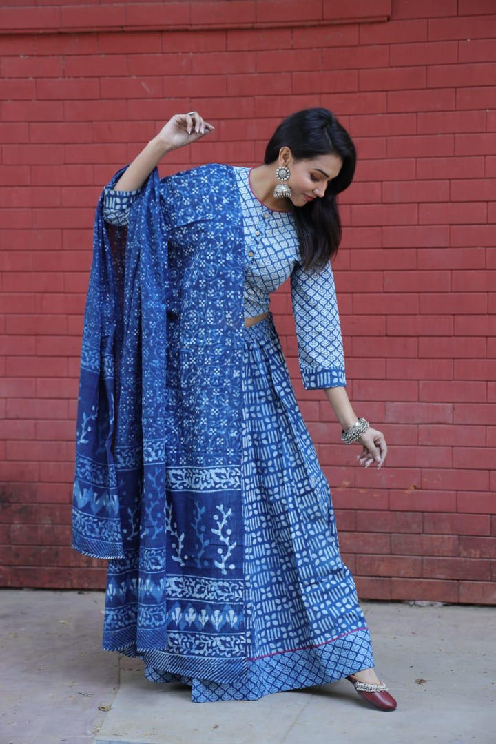 Blue Bagru Hand Block Printed Designer Top & Skirt With Mulmul Dupatta.