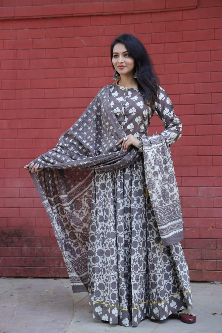 Brown Bagru Hand Block Printed Designer Top & Skirt With Mulmul Dupatta.