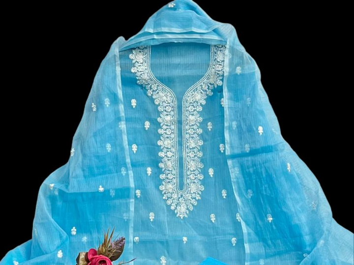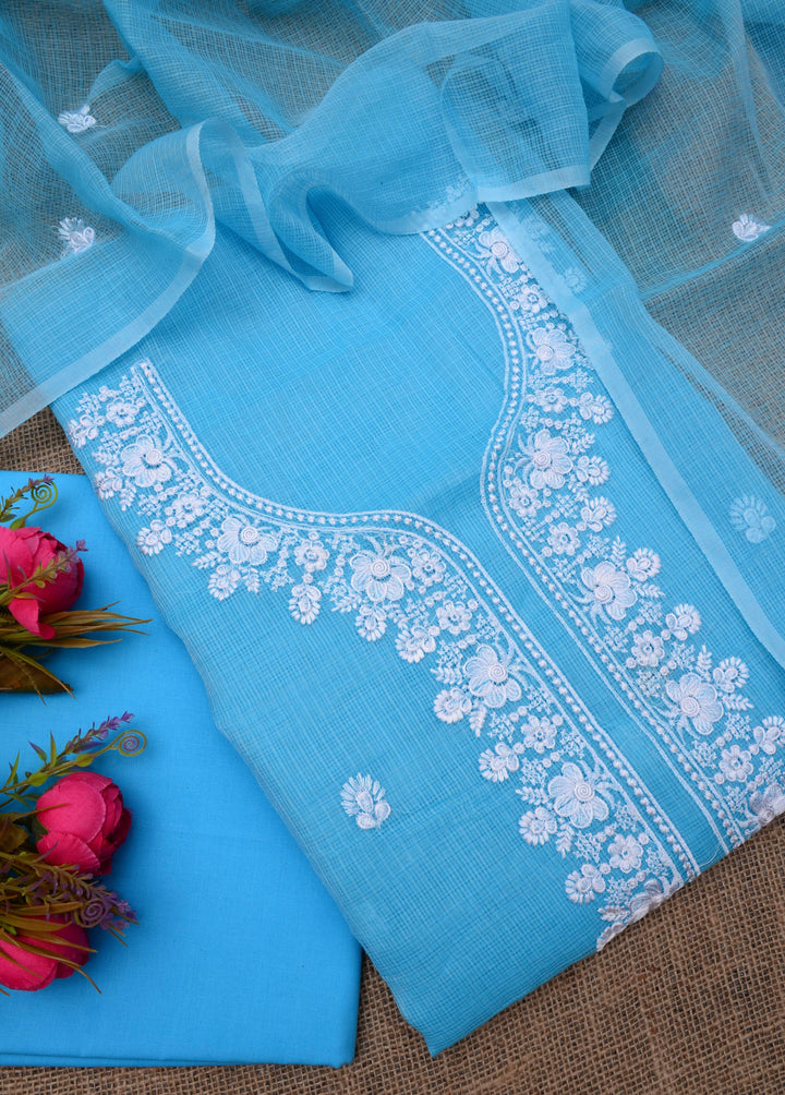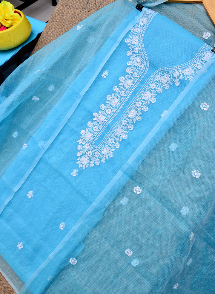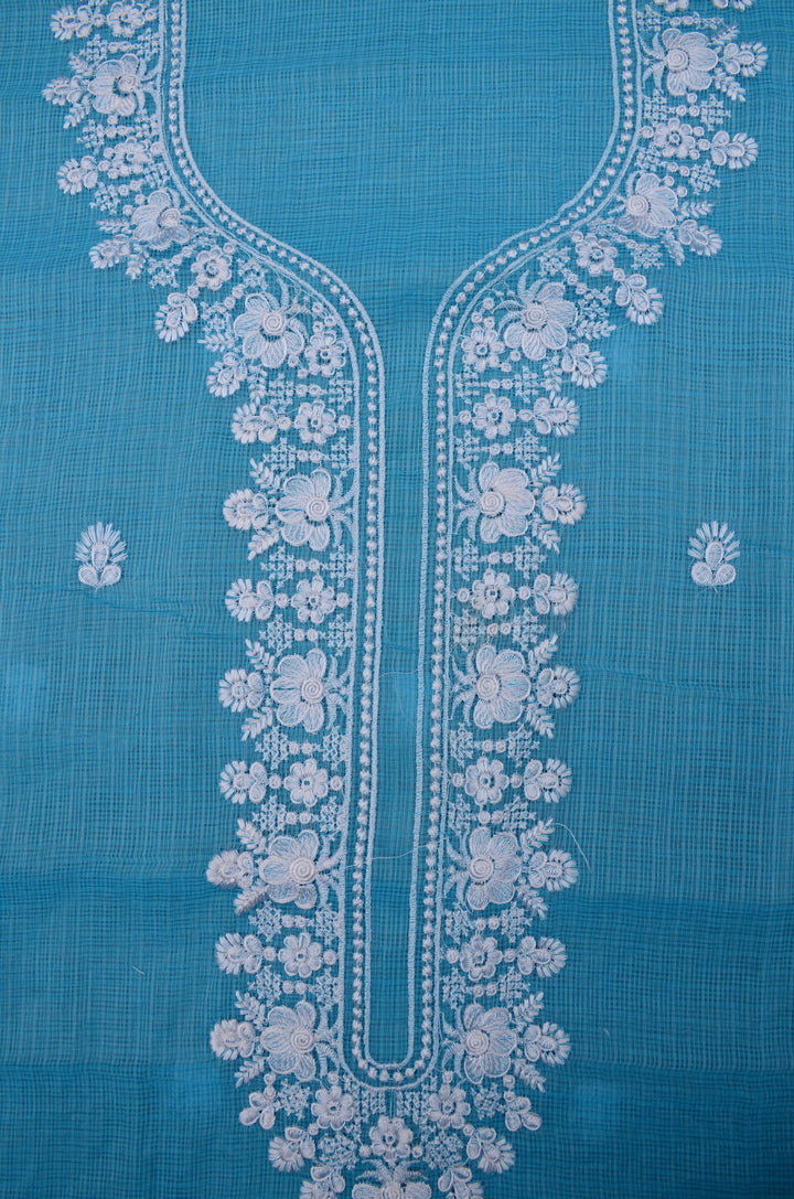 Neelkamal- A Beautiful Blue Unstitched Cotton Kurta With Matching Dupatta And Salwar. The Kota Doria Kurta Is Adorned With Beautiful Embroidedry All Over The Neckline and Small Bootas All Over. The Matching Dupatta Has Small Embroidery Bootas All Over.