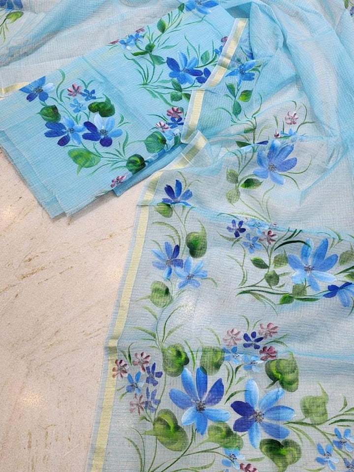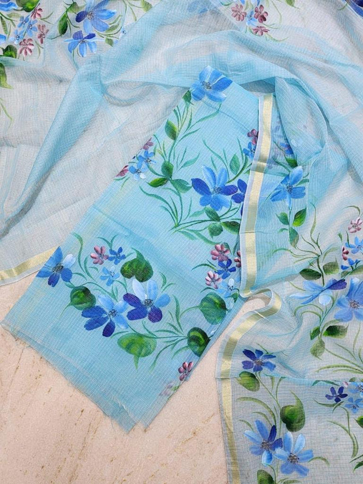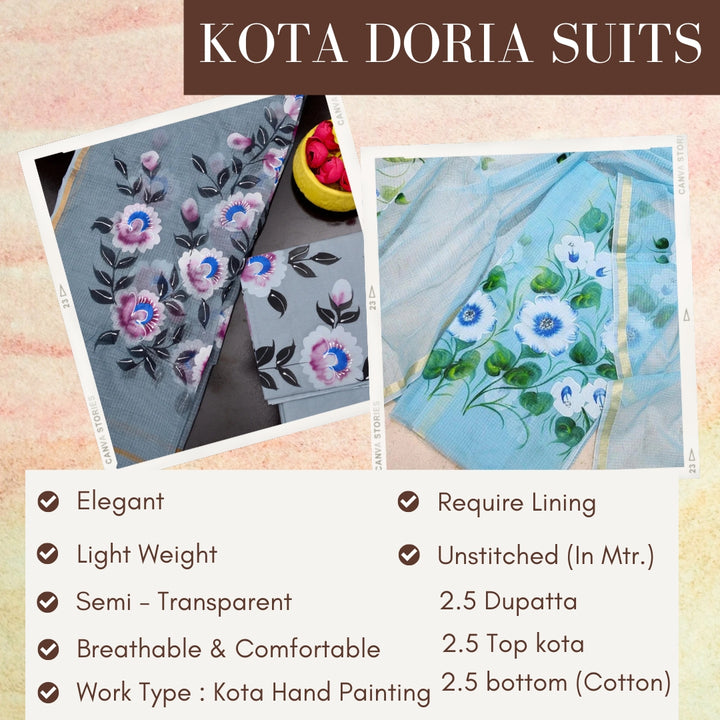 Make A Distinct Style Statement With Cotton Hand Painted Kota Doria Suit. The Blue Hand Painted Kurta With Dupatta And Bottom Fabric Adorned With Flowers Hand Painted. Team It Up With Matching Mojri's For A Perfect Festive Look. Shop Our Blue Hand Painted Kota Doria Suit With Dupatta From Webstore At Jhakahs.Com And Get Express Delivery With Cash On Delivery.