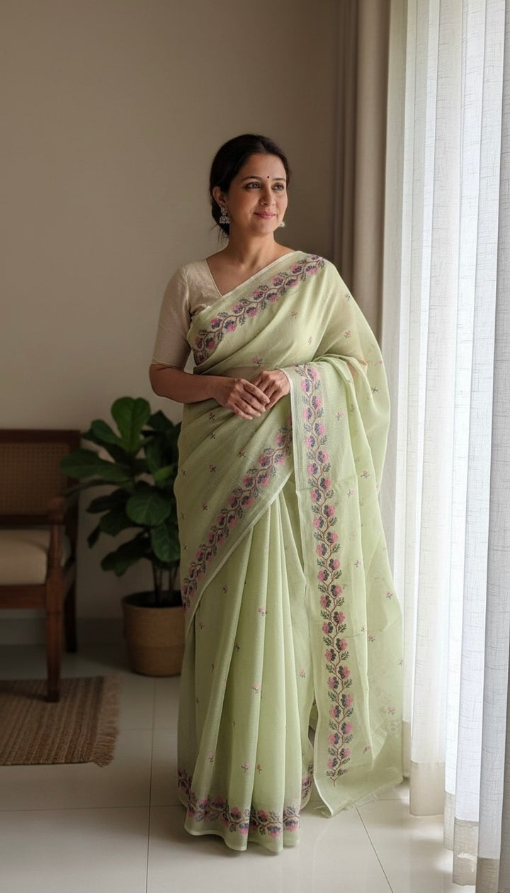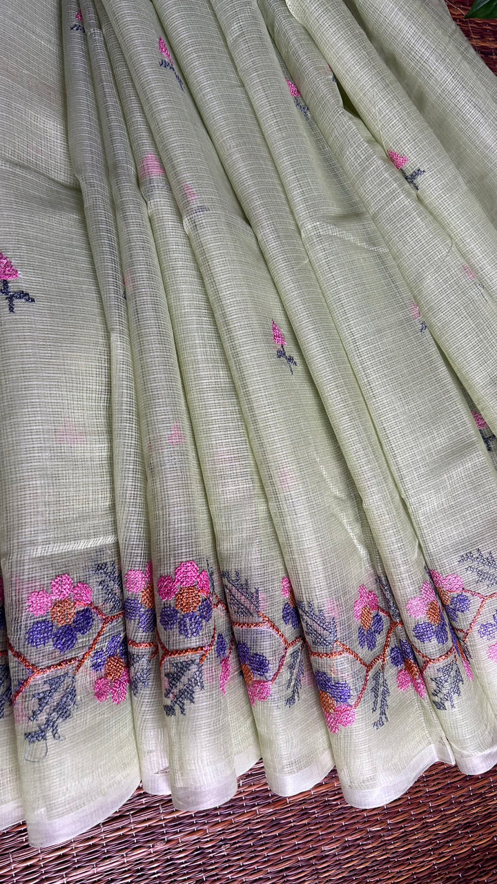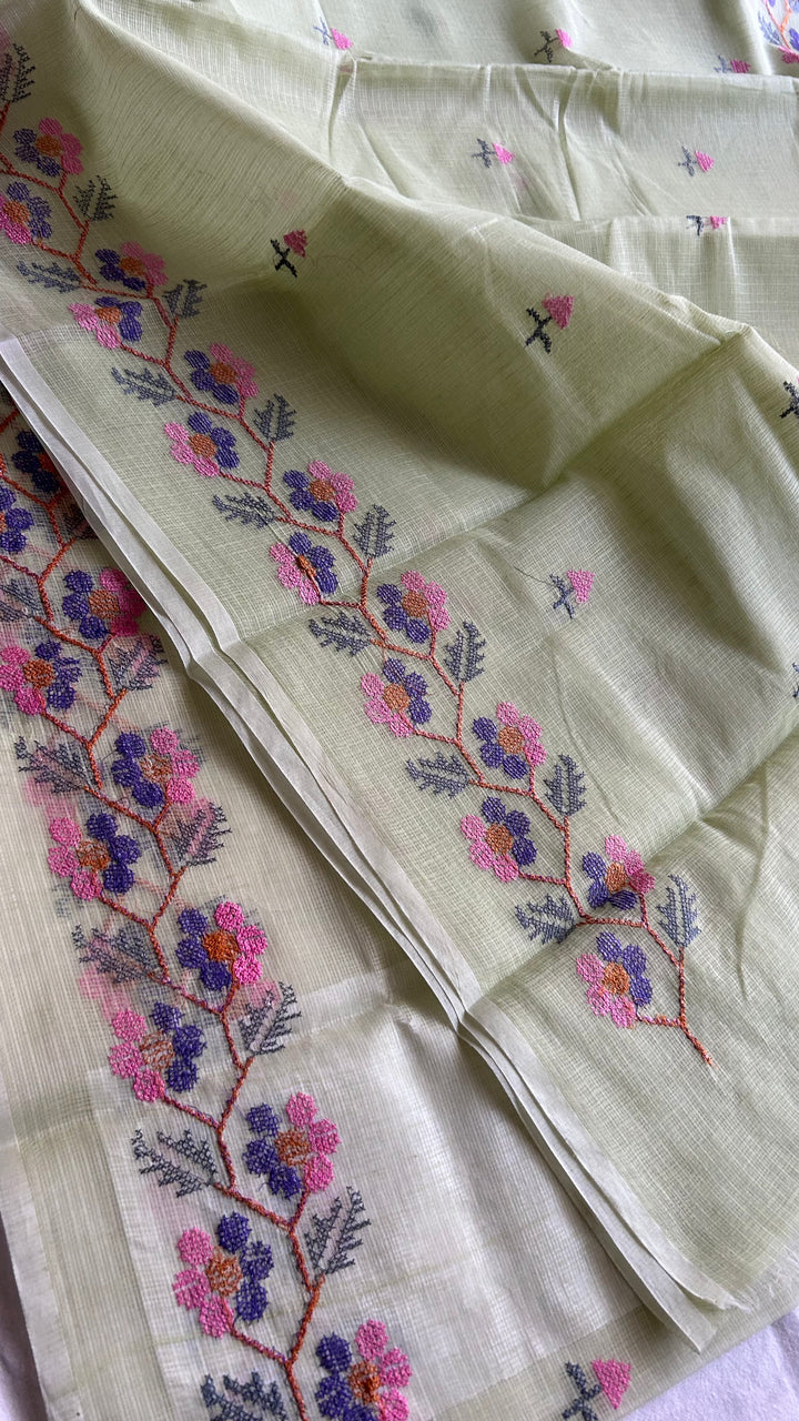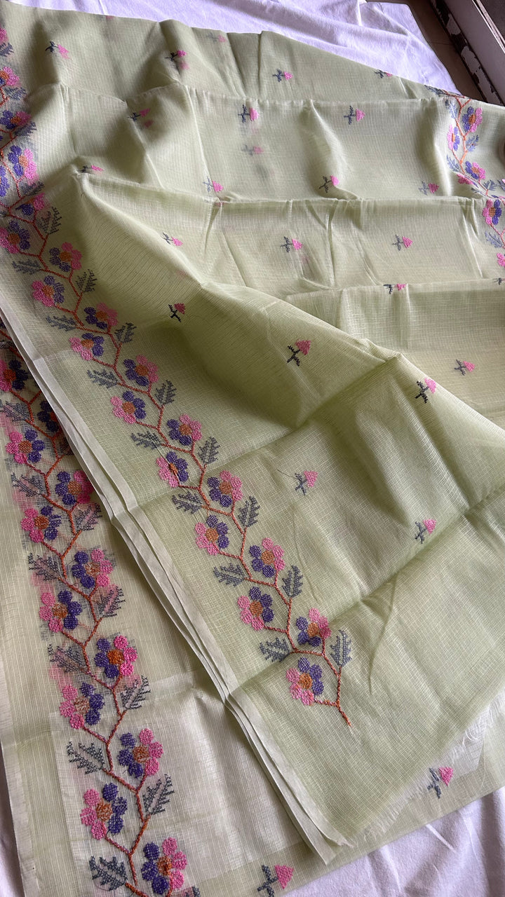 Transform your wardrobe with our Pista Green Kota Doria Cross Stitch Embroidery Work Saree!