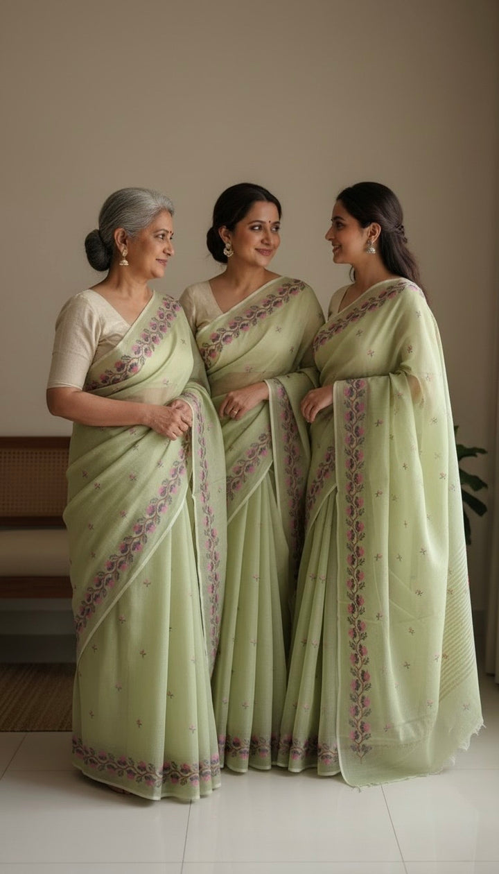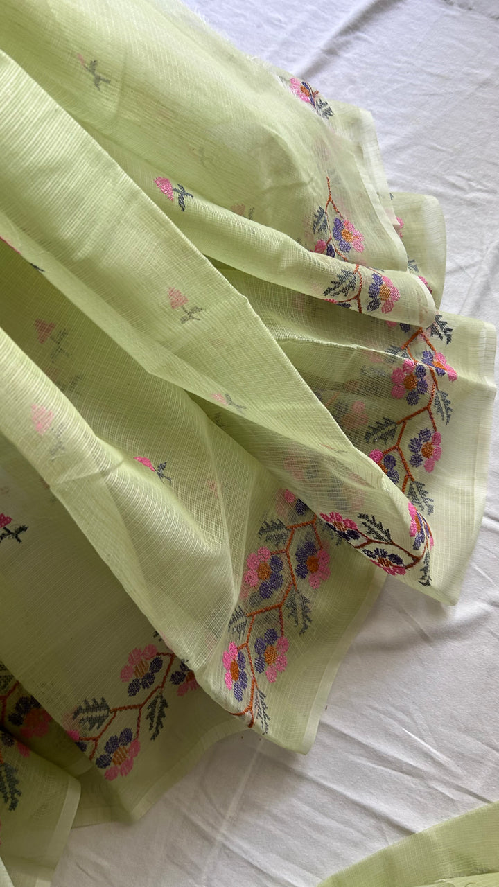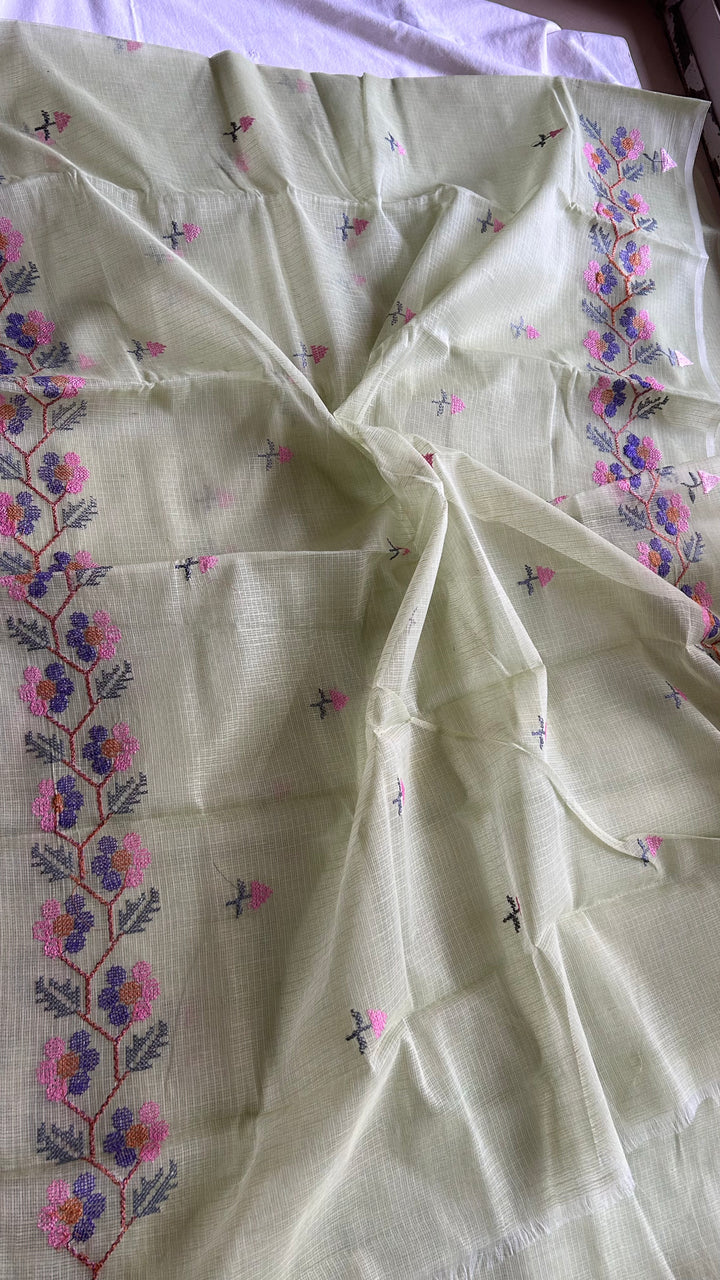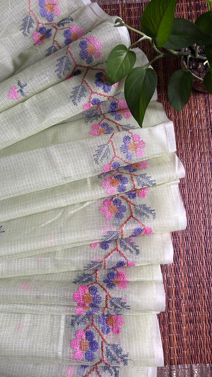 Transform your wardrobe with our Pista Green Kota Doria Cross Stitch Embroidery Work Saree!