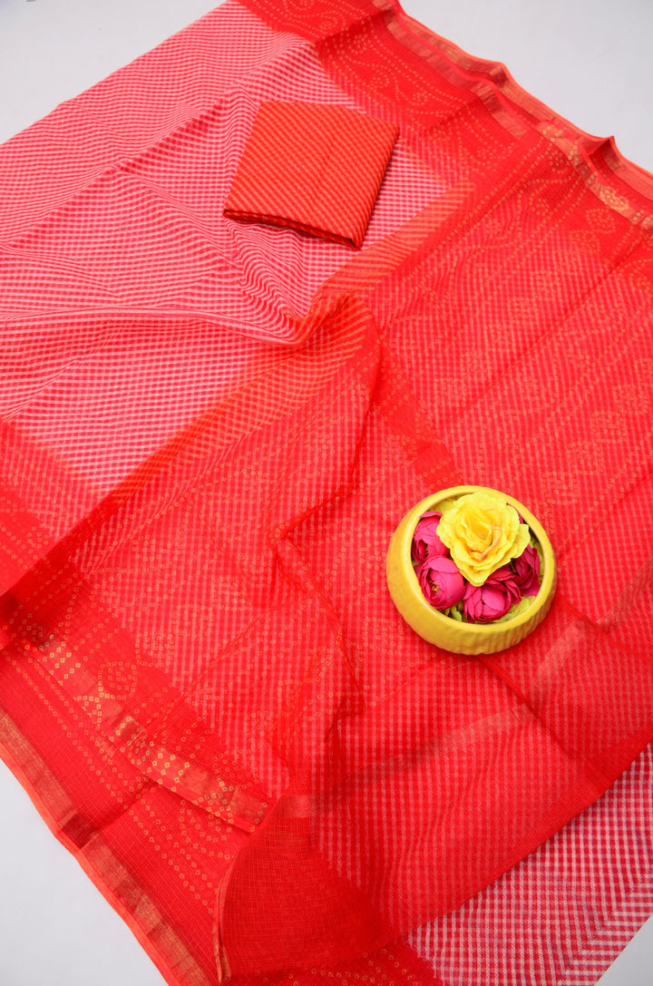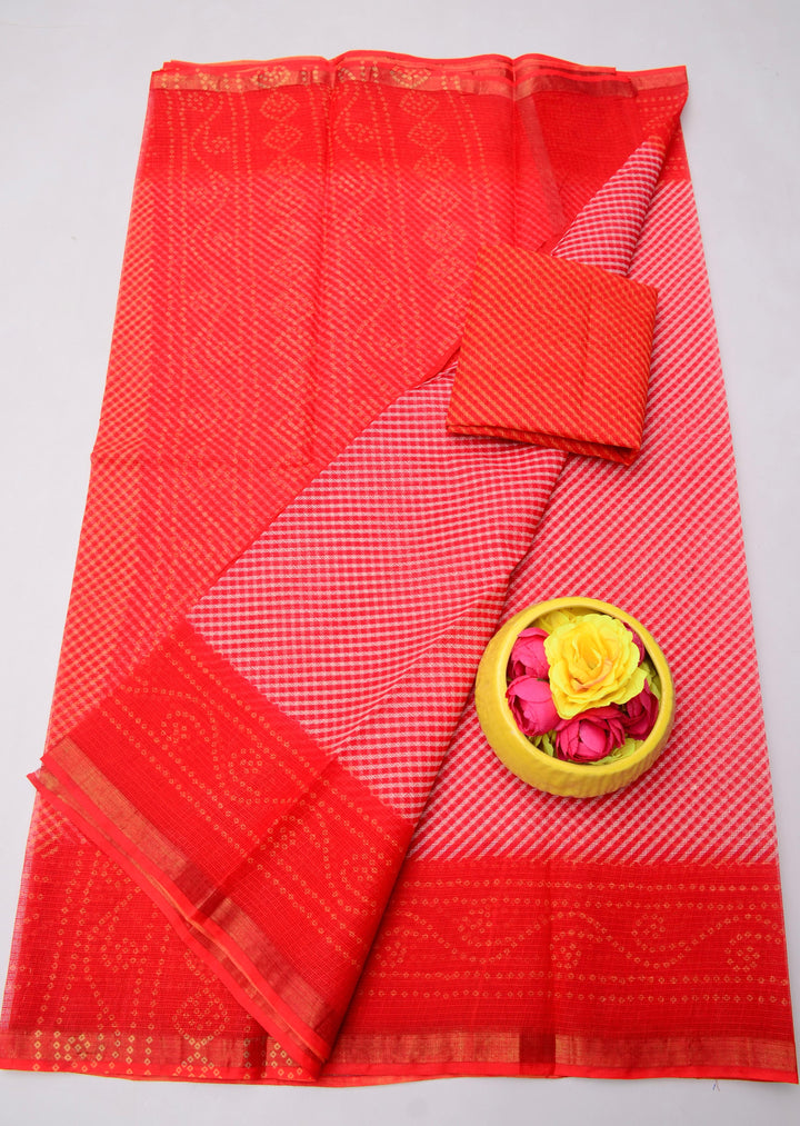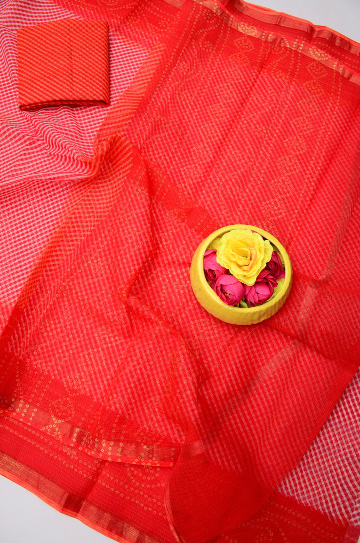 - Lali- Red leheriya Bandhej Print Kota Doria Saree
