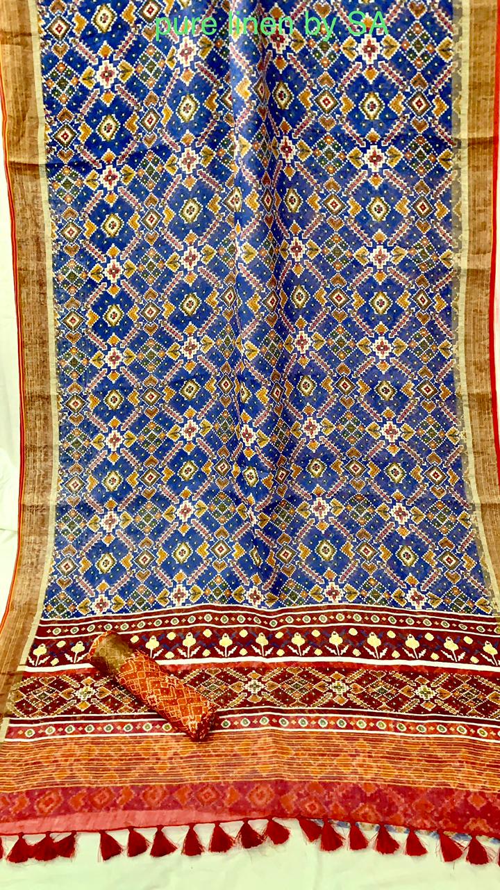 "Steal The Limelight With Blue Linen Saree With Patola Print. These Linen Sarees Are Always In Fashion And Perfect For Any Of Occasion Makes If Wardrobe Essential. This Linen Saree Comes With A Matching Blouse Which Can Be Styled According To Your Design. The Tassels On Pallu Adds Charm To It. Grab It Now Before Its Gone. <br> Fabric: Linen</br>