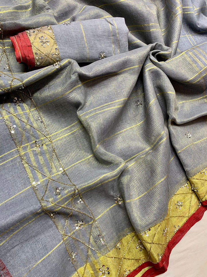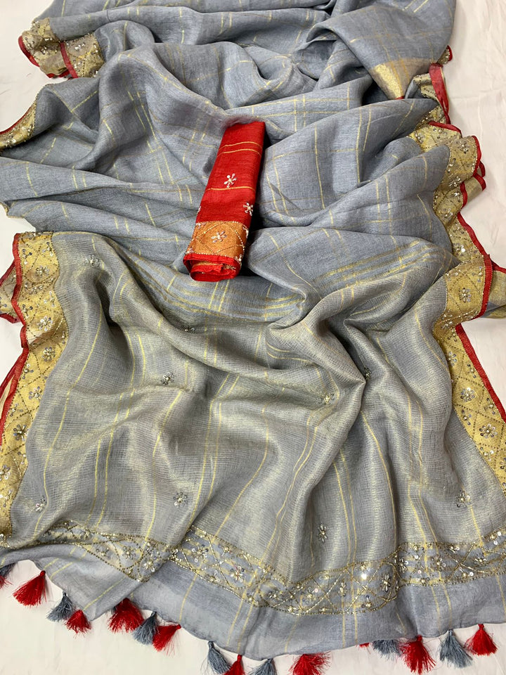 The Linen Saree With Embroidery Has Beautiful Shades Of Grey and have beautiful sequence work. This Linen Saree Comes With A Contrast Red Blouse Which Can Be Stitched As Per Your Size And Style. The Tassels On Pallu Adds Charm To It.