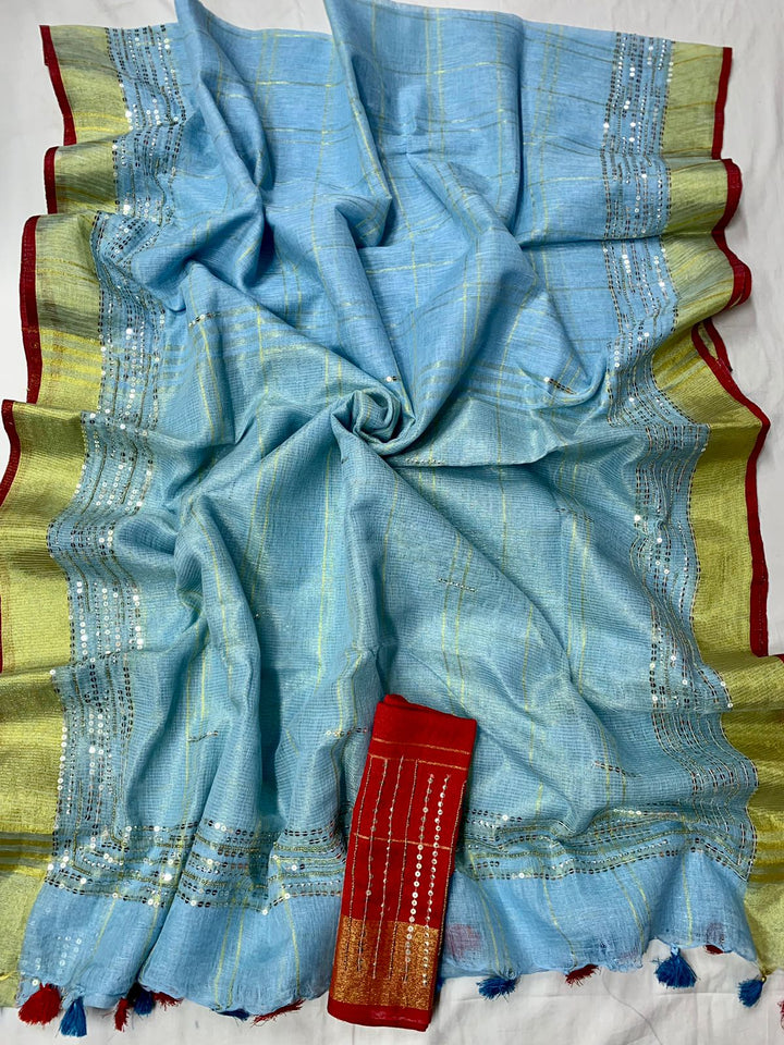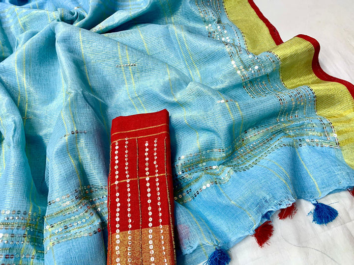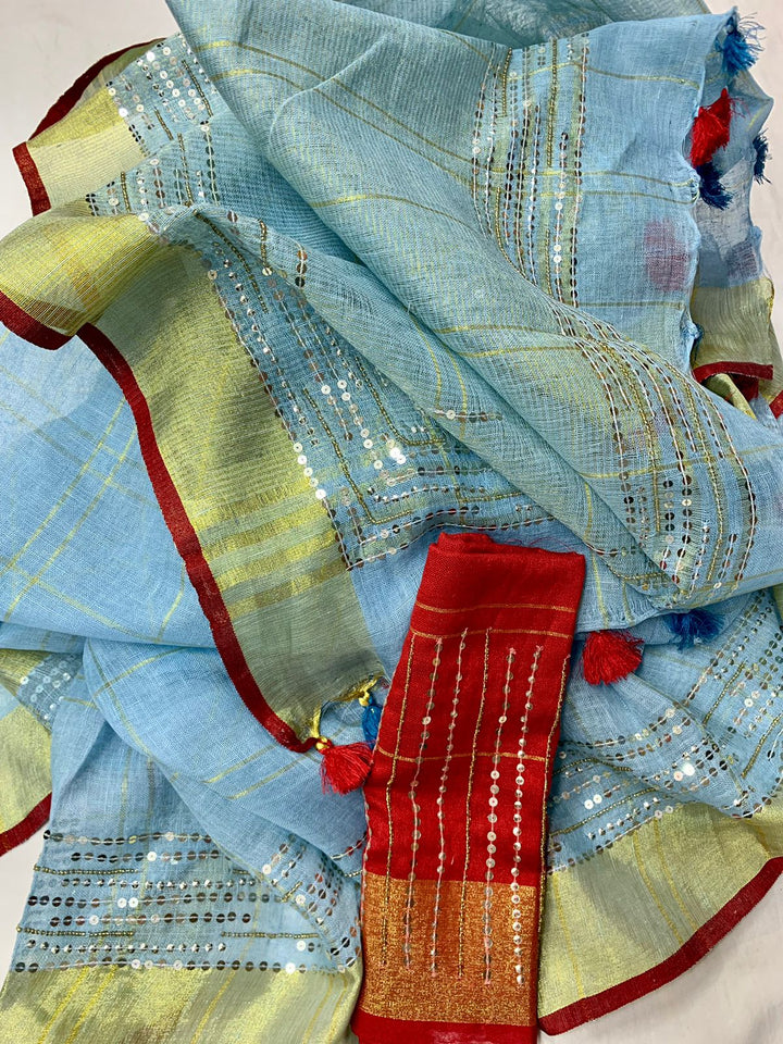 The Linen Saree With Embroidery Has Beautiful Shades Of blus and have beautiful sequence work. This Linen Saree Comes With A Contrast Red Blouse Which Can Be Stitched As Per Your Size And Style. The Tassels On Pallu Adds Charm To It.