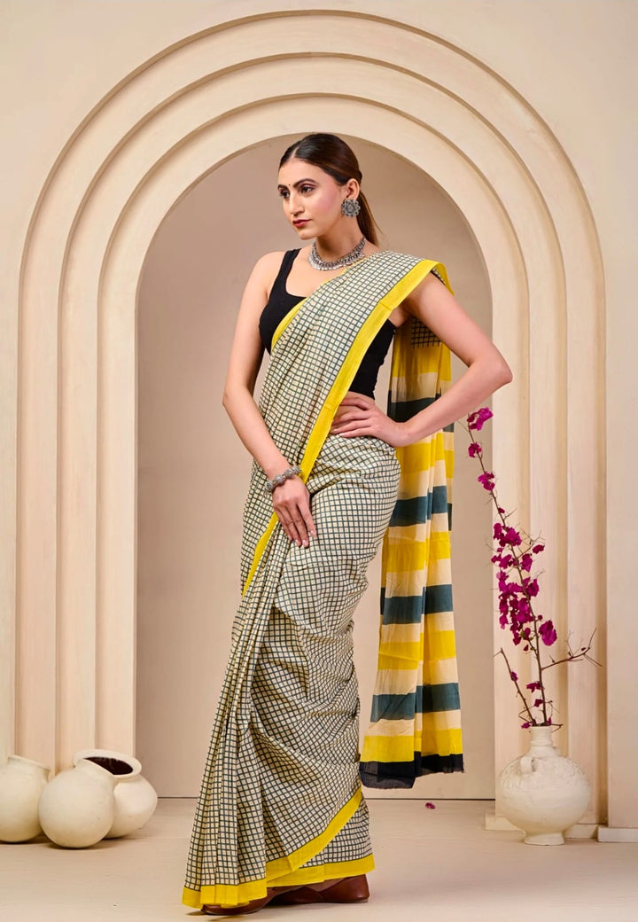 - Yellow Trending indigo Hand-Block Print Mul Mul Cotton Saree