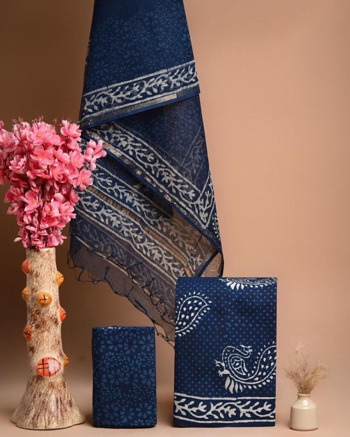 True Elegance Will Come Out Of Your Dressing Style With Our blue Colored Dress Material. This suit comes along with cotton bottom and Matching kota doriya block print dupatta. Women can buy this suit to wear for their Summer Outfit or office wear look .