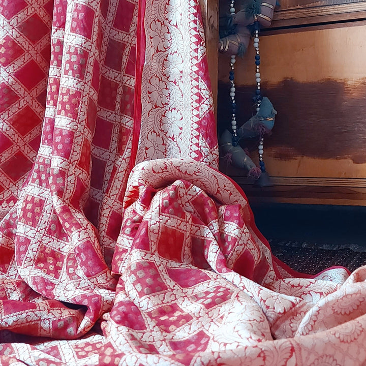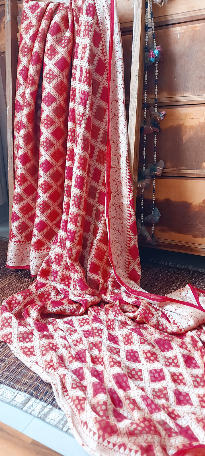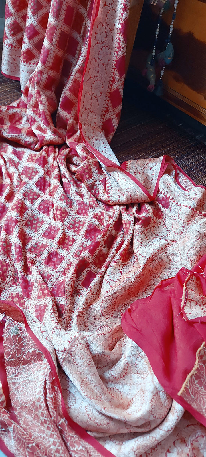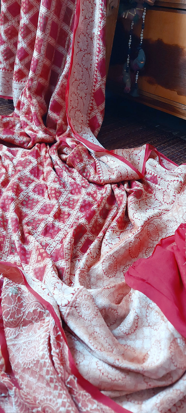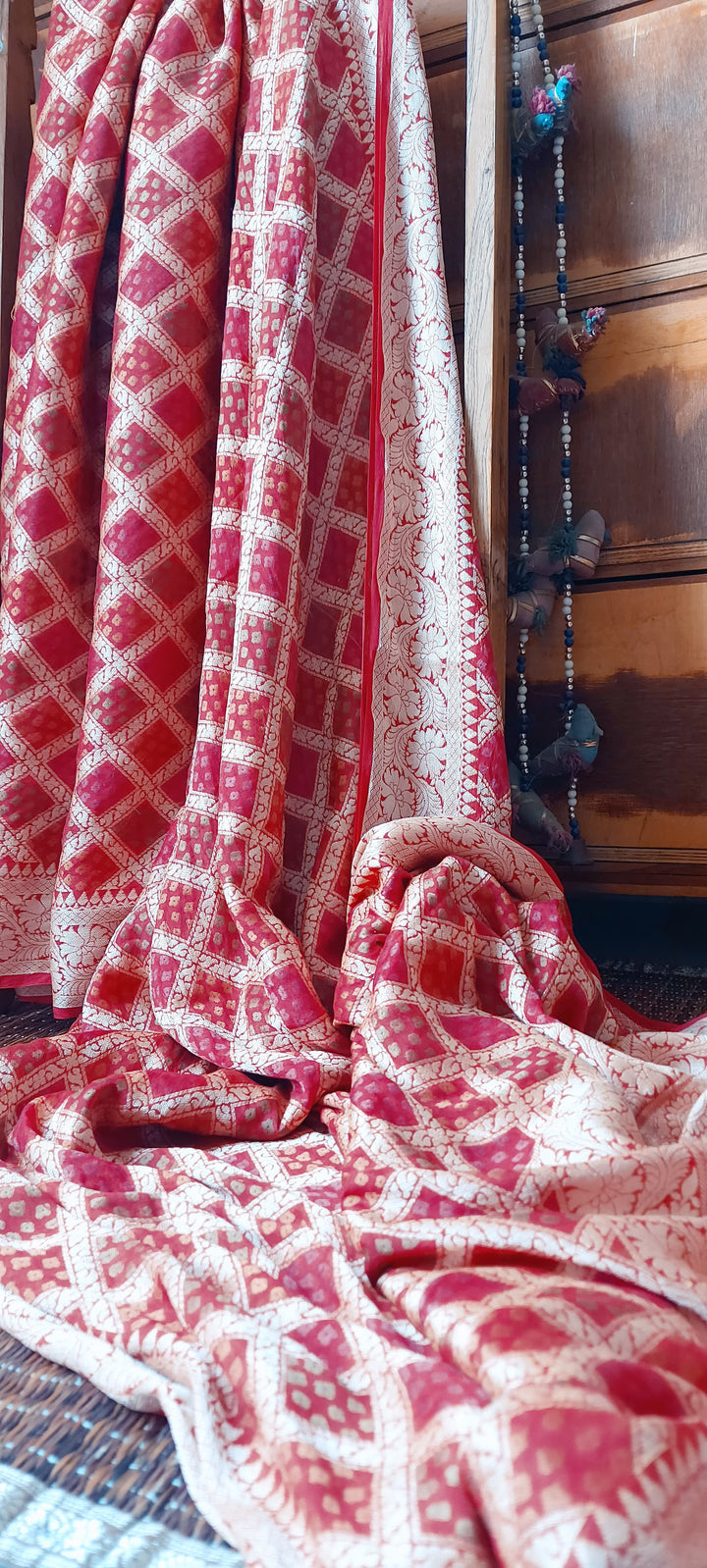RED banarasi georgette bandhani saree with full resham weaves and jaal. This is pure bridal wear red bandhej banarasi saree also known as ghatchola saree few call it as gharchola saree also. saree is full resham weaved very soft and flowy fabric, comes with plain same color blouce with border.åÊ