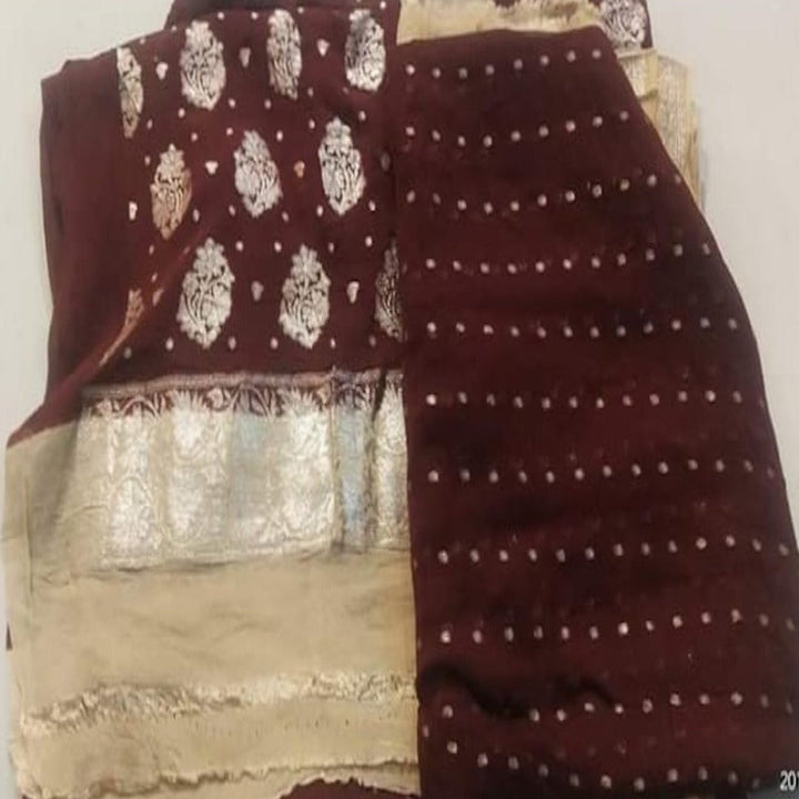 Unstitched Pure Banarasi Khaddi Georgette Suits In brown and cream With Gorgeous Boota on Full Suit With Designer Similar Border Dupatta and pure crepe bottom . shop authentic banarasi georgette salwar suit online.