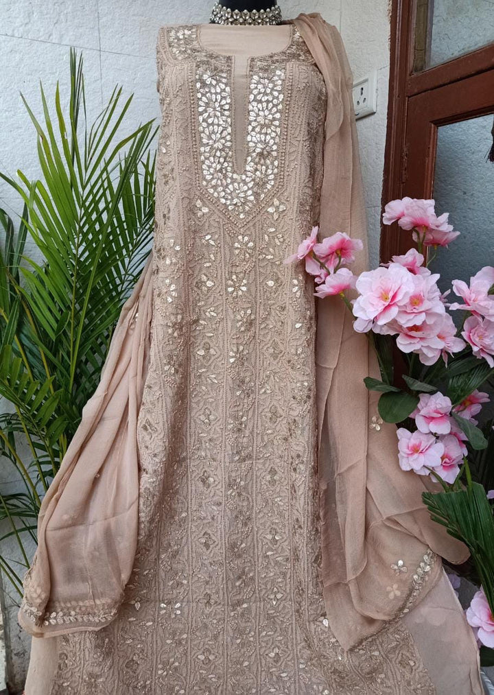 "Kahkashan" Brown colour Chikankari Gota Salwar Suit,This Chikankari Salwar Suit Comes With Pure Hand Karigari And Mukaish And Gota Patti Work As Shown In The Picture.Georgette Chikankari Top With Chikankari Gota/Mukaish Work And Chiffon Duptta With Gota Work And Matching Plain Santoon Bottom.It comes with 3mtr top, 2.5 mtr bottom, 2.5 dupatta