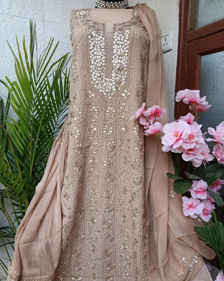- "Mitti" Brown Lucknowi Chikankari Gota Patti Salwar Suit Fabric