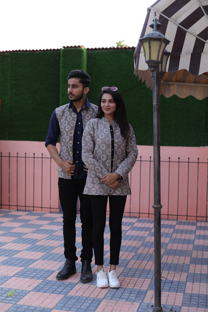 Brown Color Twinning Couple Pure Cotton Bagru Print Quilted Reversible Jackets