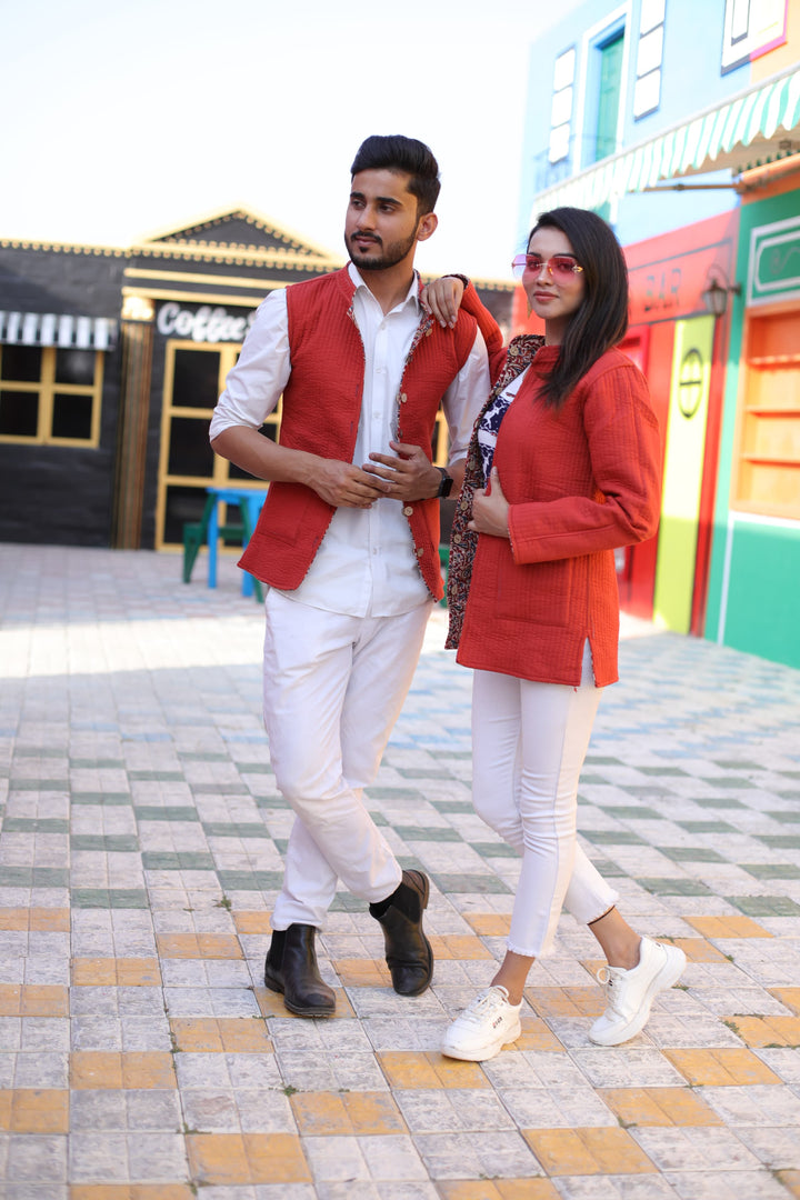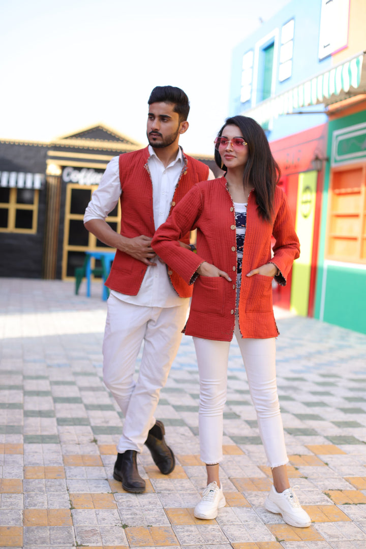 Red Color Twinning Couple Pure Cotton Bagru Print Quilted Reversible Jackets