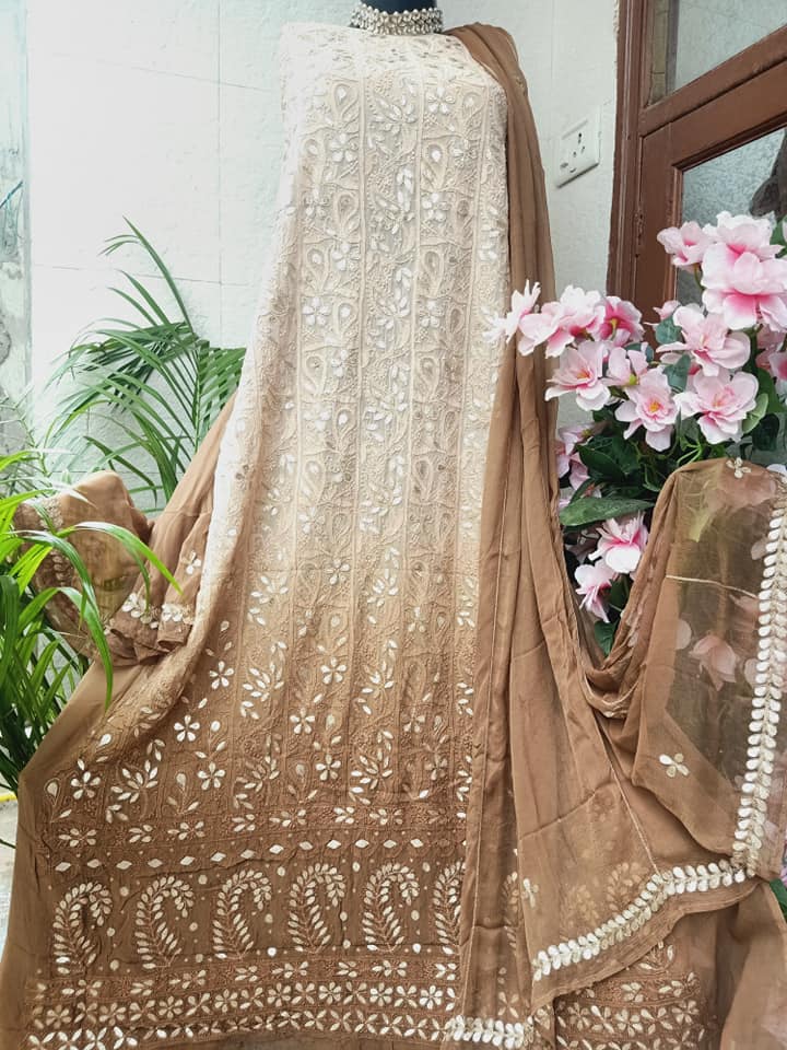 "Chai" Brown Ombre Pure Georgette Lucknowi Chinkari Gota Patti Salwar Suit Material