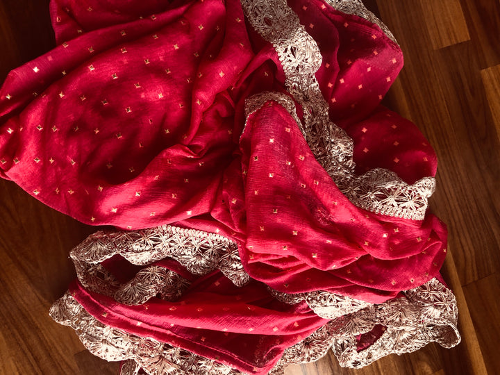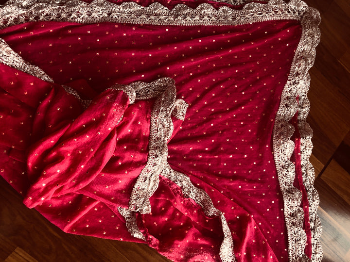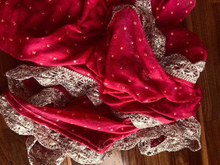 Impart a look full of elegance, style and class with this stunning REd Bridal LookåÊdupatta from Jhakhas. Crafted in premium quality chiffon this dupatta is accented with elegant gotta patti work details and makes for an apt inclusion to your traditional wardrobe. Tailored for perfection, coordinate this dupatta with a pared-back kurta and palazzo set to attain an alluring festive look.