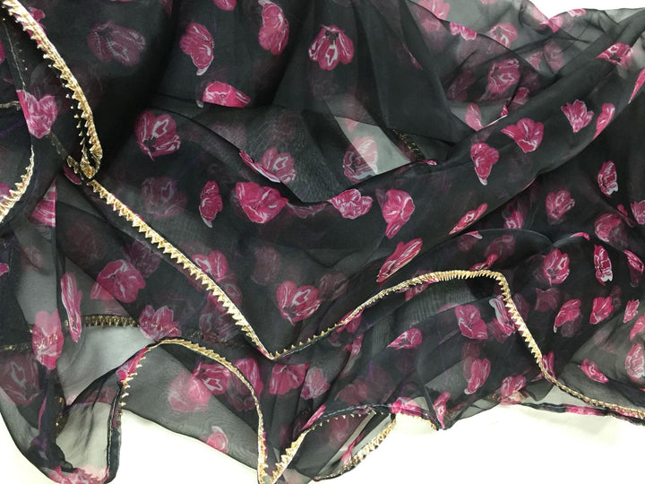 Impart a look full of elegance, style and class with this stunning flocalåÊdupatta from Jhakhas. Crafted in premium quality organza aåÊthis dupatta is accented with elegant gota border details and makes for an apt inclusion to your traditional wardrobe. Tailored for perfection, coordinate this dupatta with a pared-back kurta and palazzo set to attain an alluring festive look.