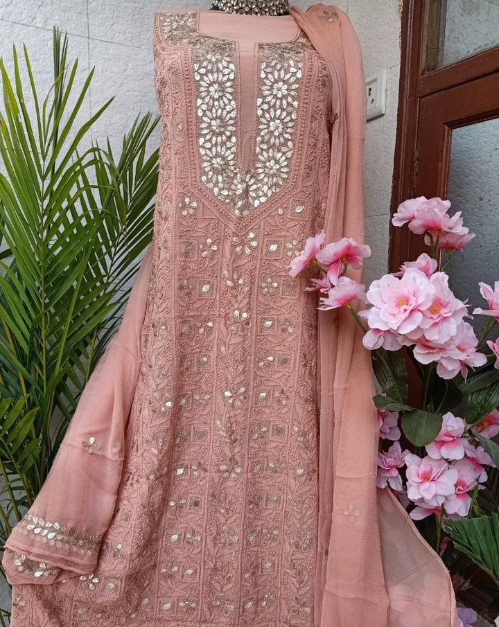 "Mahzara" Blush Peach Unique Lucknowi Chikankari Gota Patti Unstitched Salwar Suit