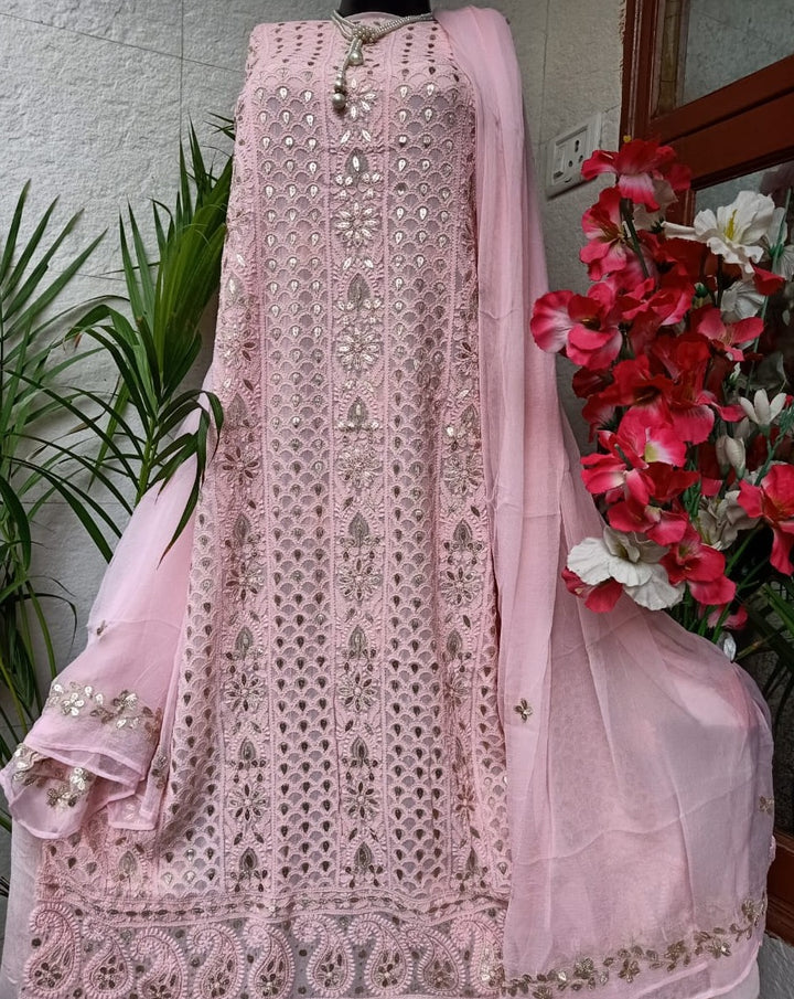 - “Gulabi Sukoon” Peaceful Pink Lucknowi Chikankari Gota Patti Salwar Suit Fabric