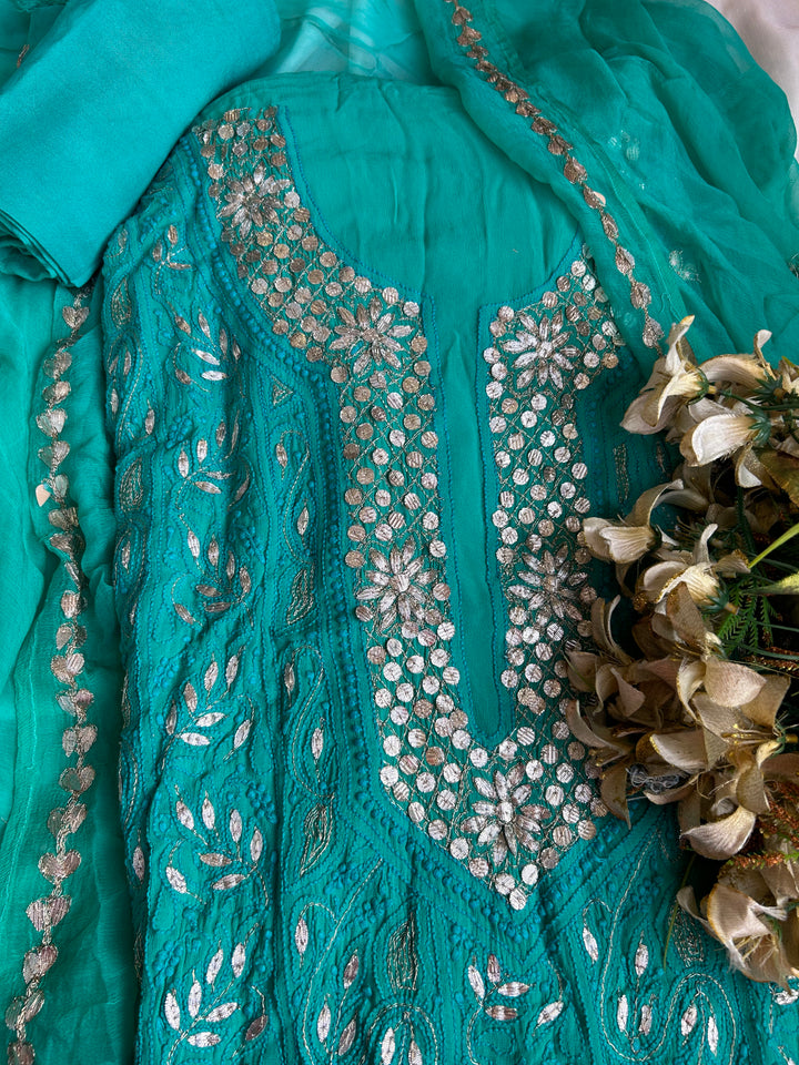 - “Samandar” Teal Green Lucknowi Chikankari Gota Patti Salwar Kameez Dress Material