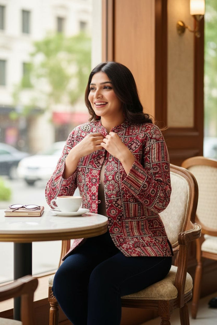 Red Pure Cotton Quilted Reversible Traditional Jaipuri Print Jackets